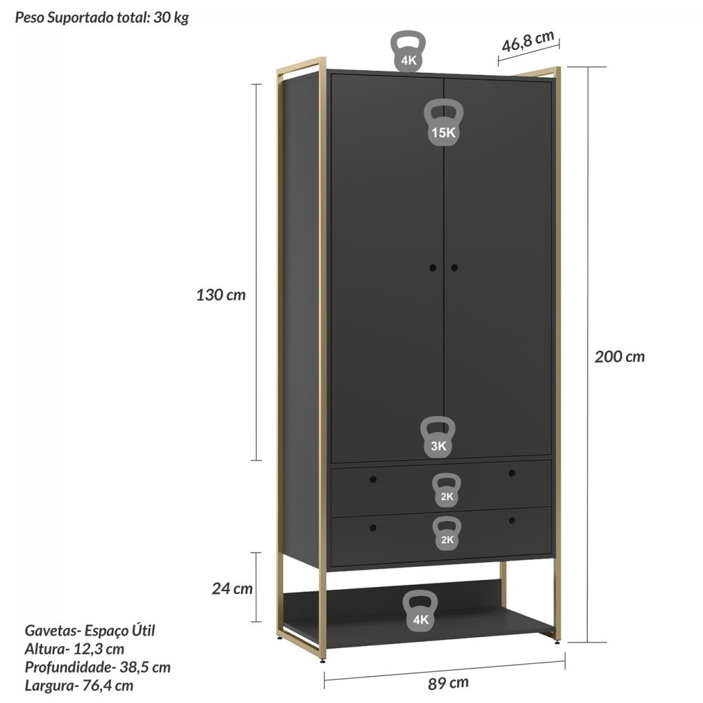 Guarda Roupa Closet Estilo Industrial Moderno Quarto cabideiro 2 Portas 2 Gav Preto - Olivar Móveis