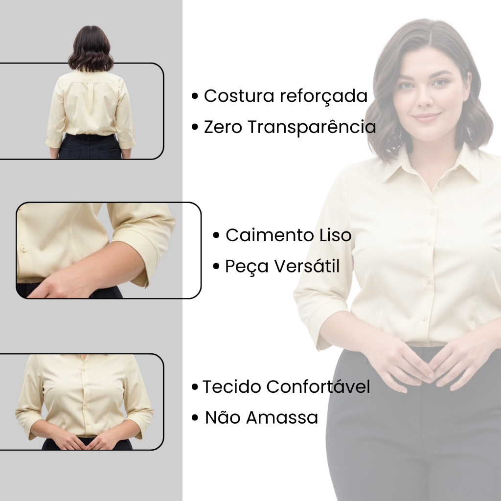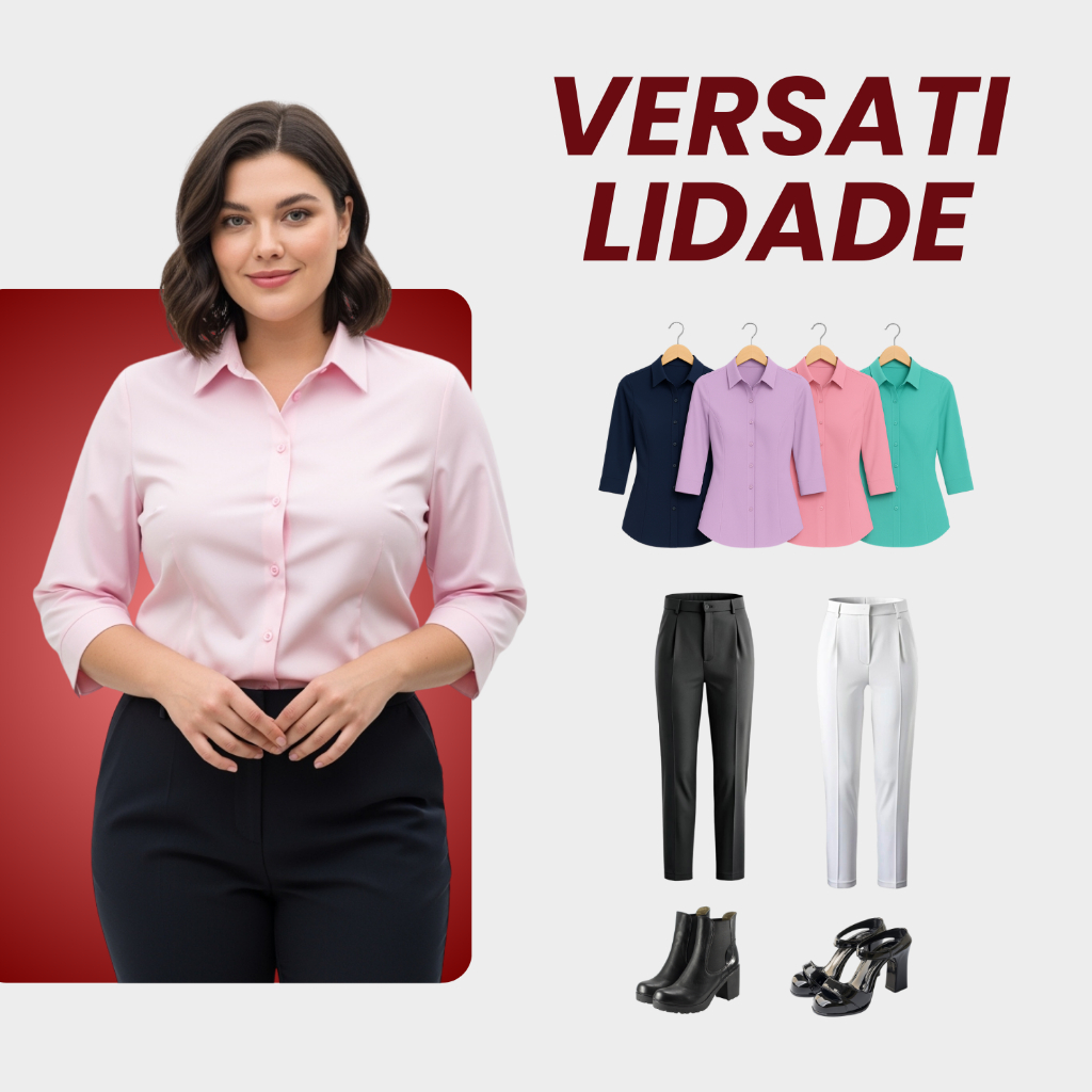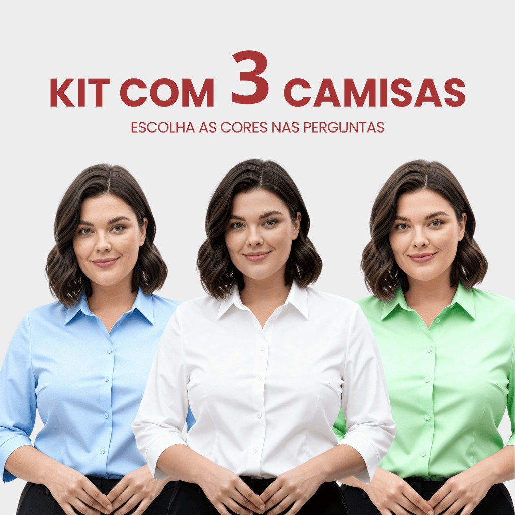 Kit 3 Camisa Social Feminina Manga 3/4 Plus Size Blusa Social Tamanho Especial Tecido Não Amassa Camiseta Com Elastano
