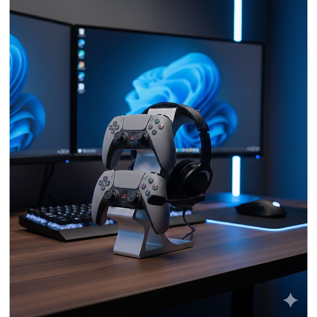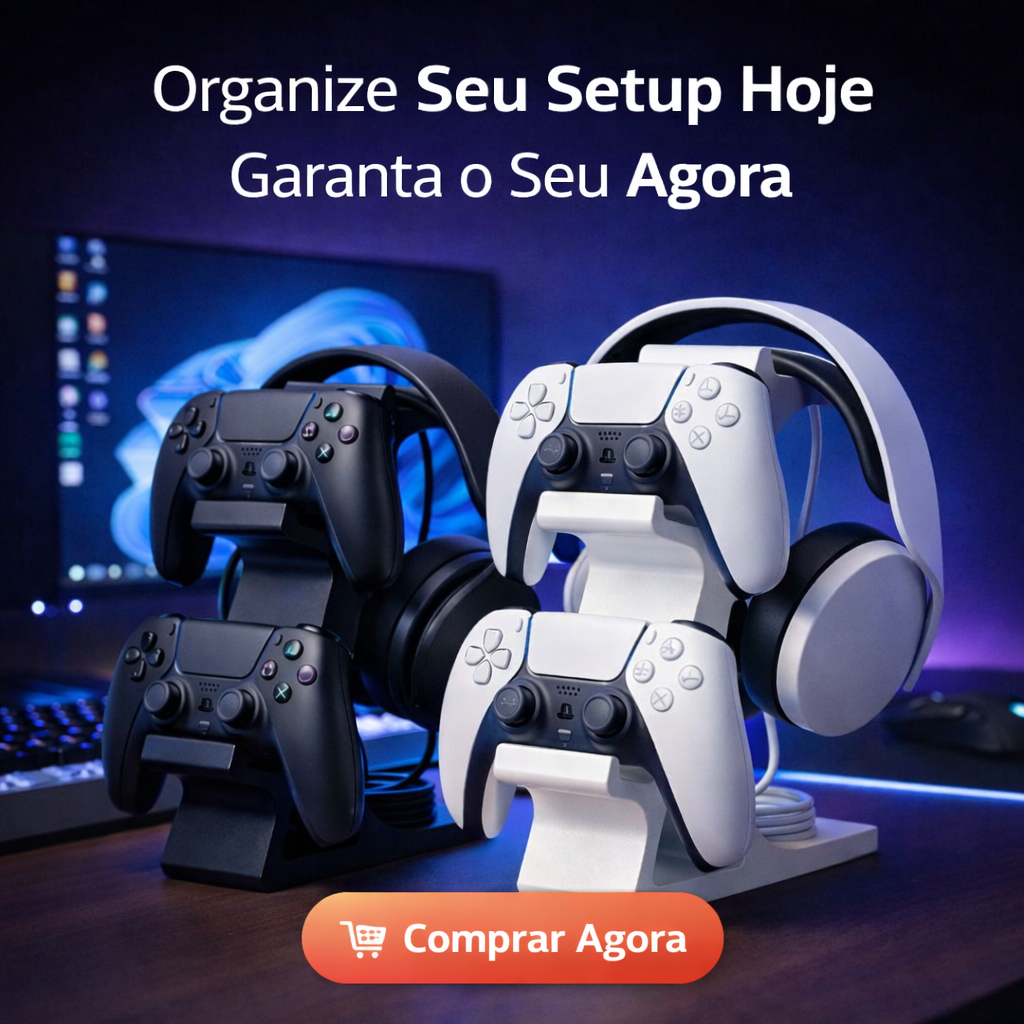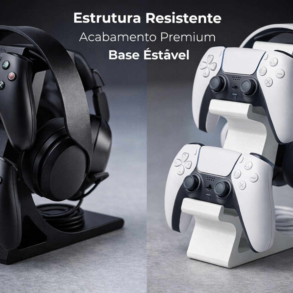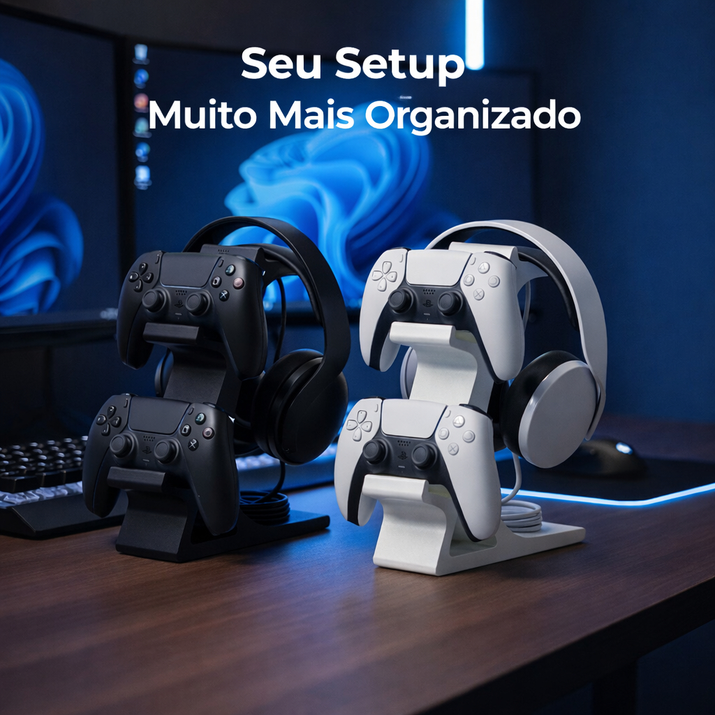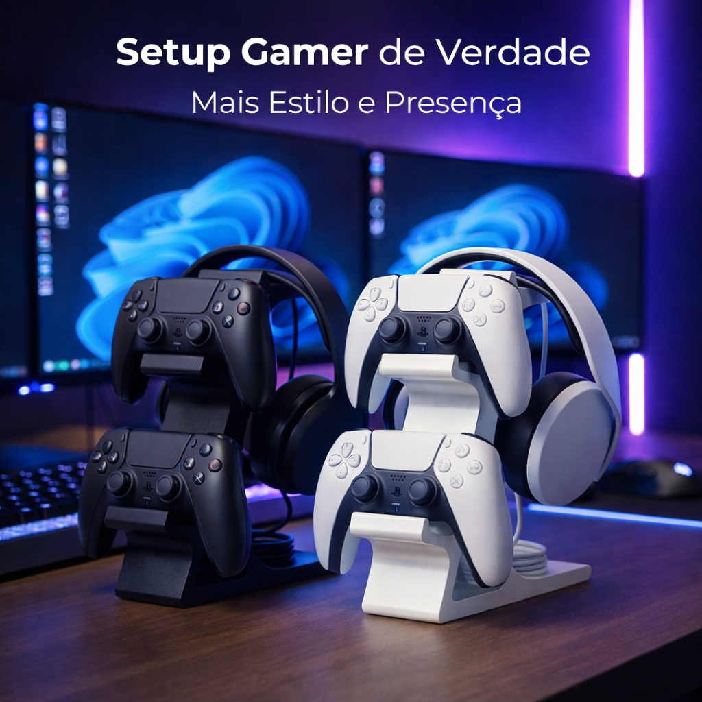 Suporte para 2 Controles PS2 + Headset | Organizador Gamer de Mesa | Base Estável e Compacta