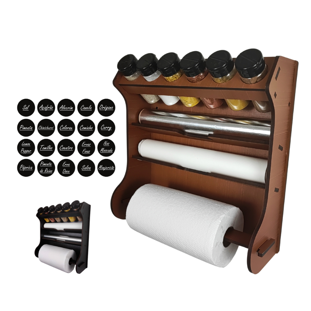 Porta Condimentos 6 Potes Para Parede com Porta Papel Toalha e Papel Alumínio.