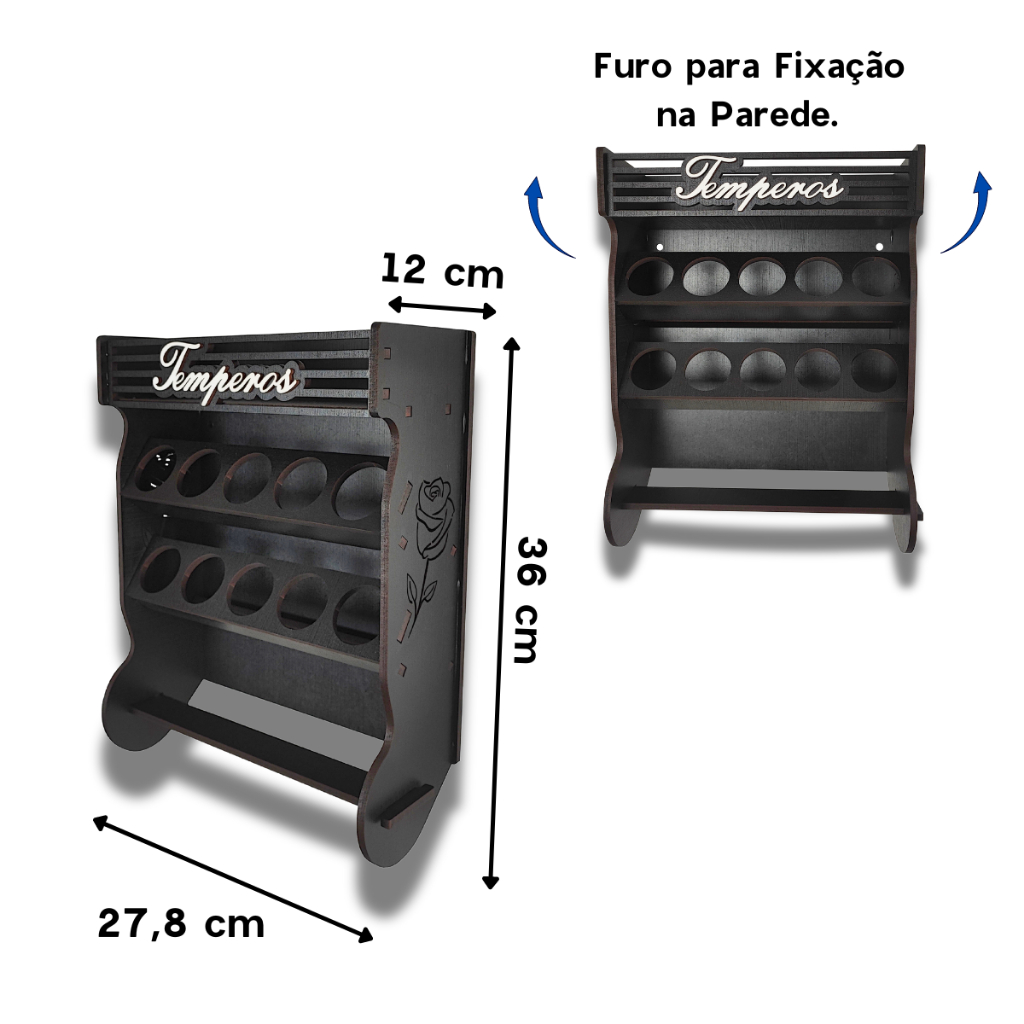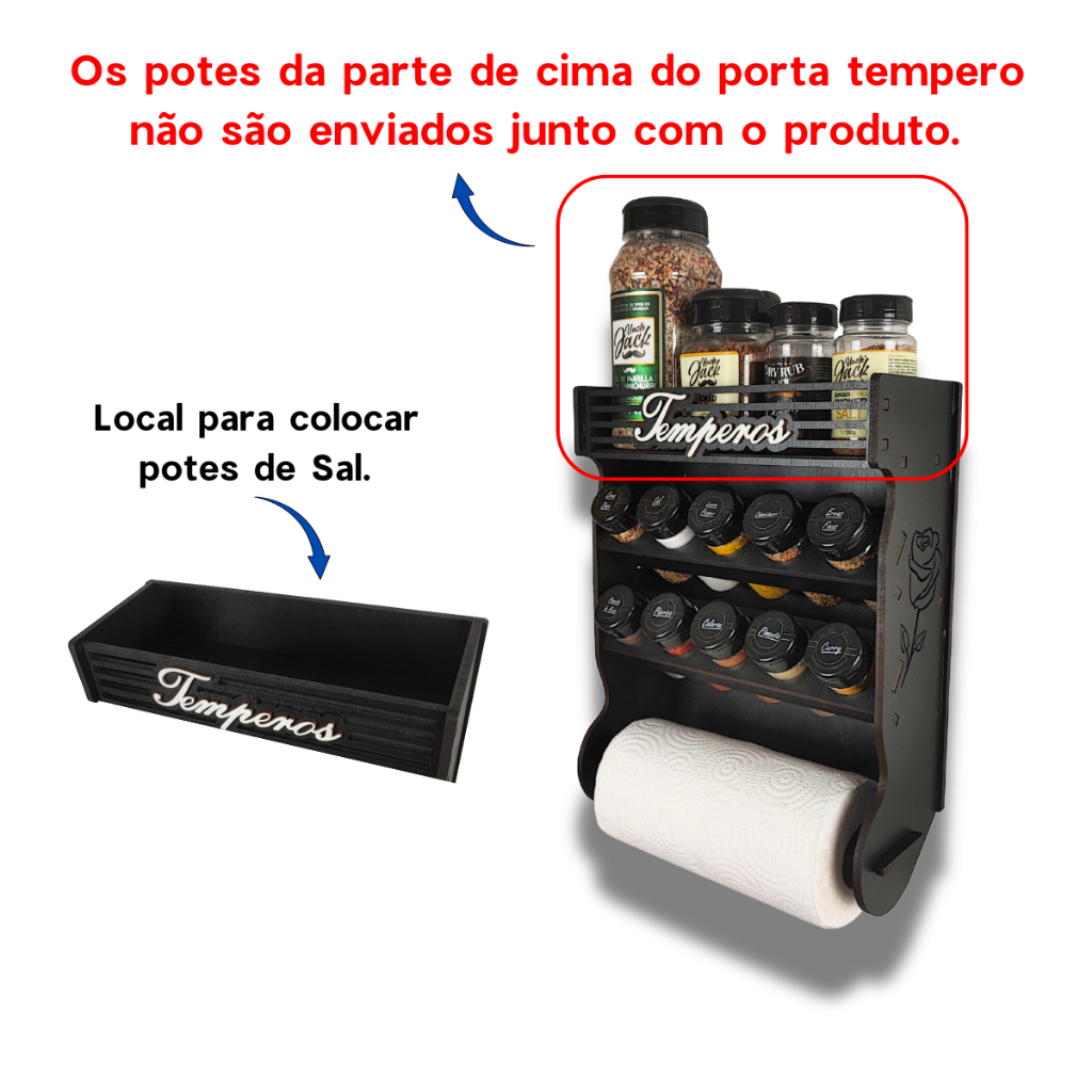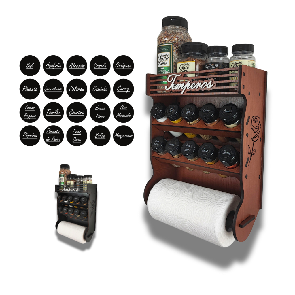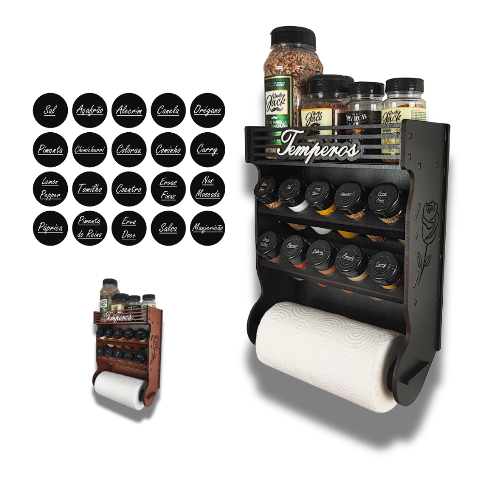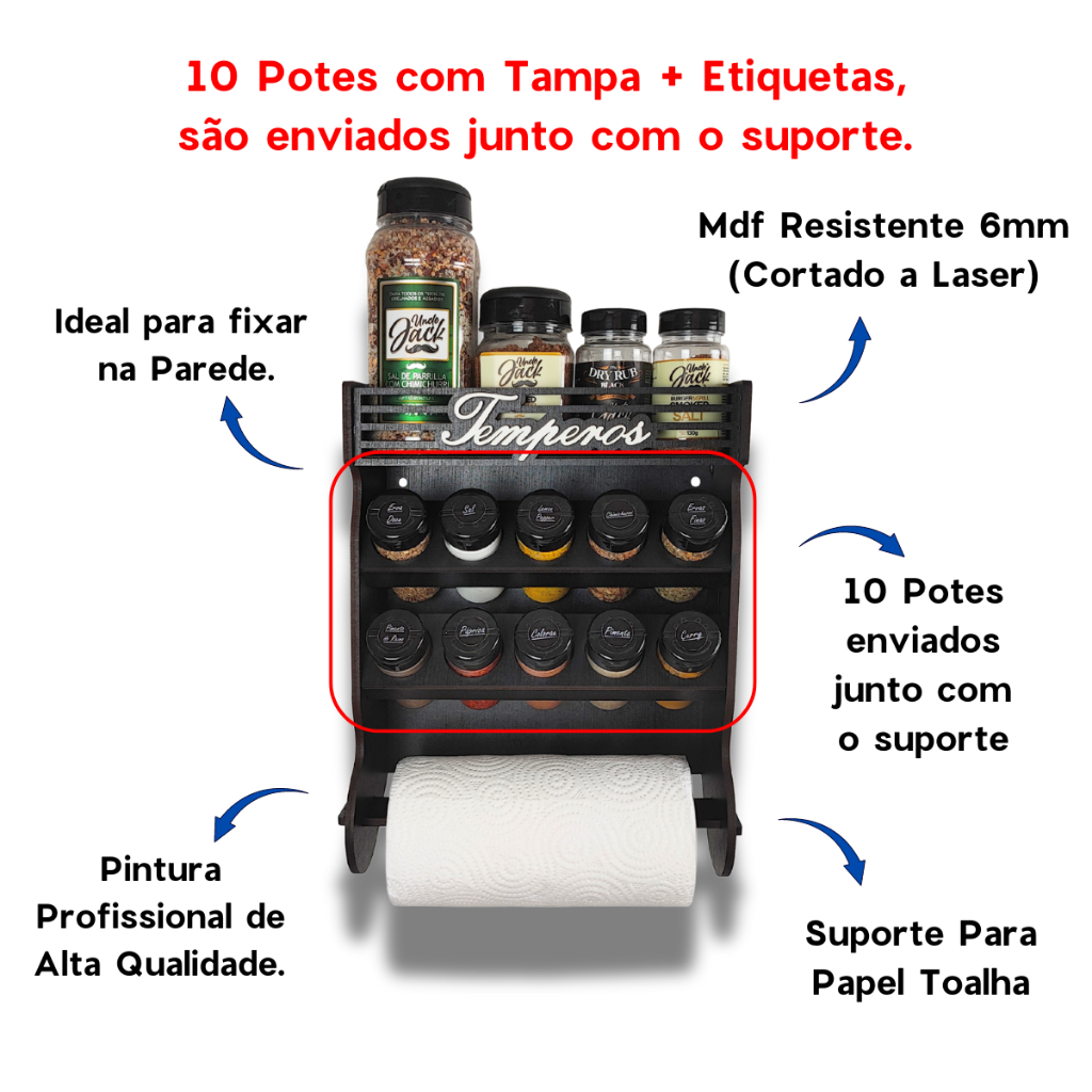 Porta Temperos Papel Toalha Parede 10 Potes com Local Para Colocar Potes de Sal e Cartela de Etiquetas.