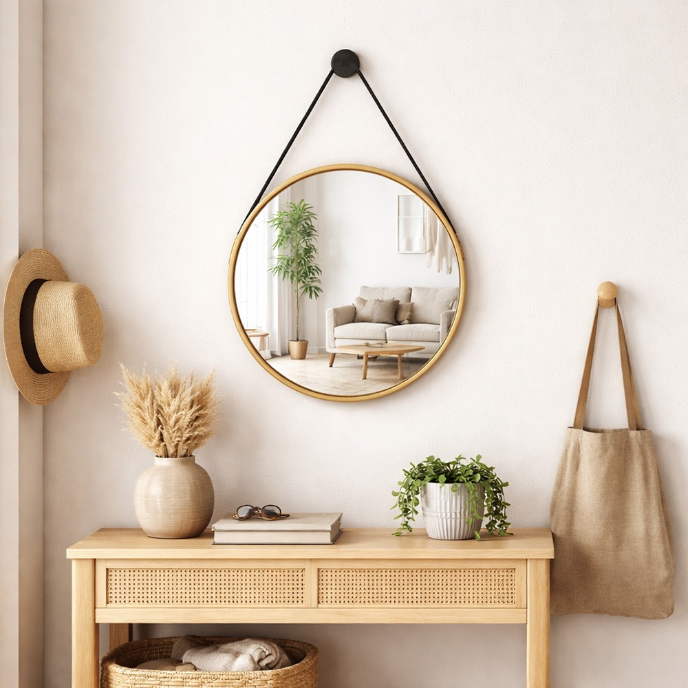 Espelho Redondo Adnet 40cm Com Alça Couro Suporte Pendurador Sala -Quarto - Banheiro