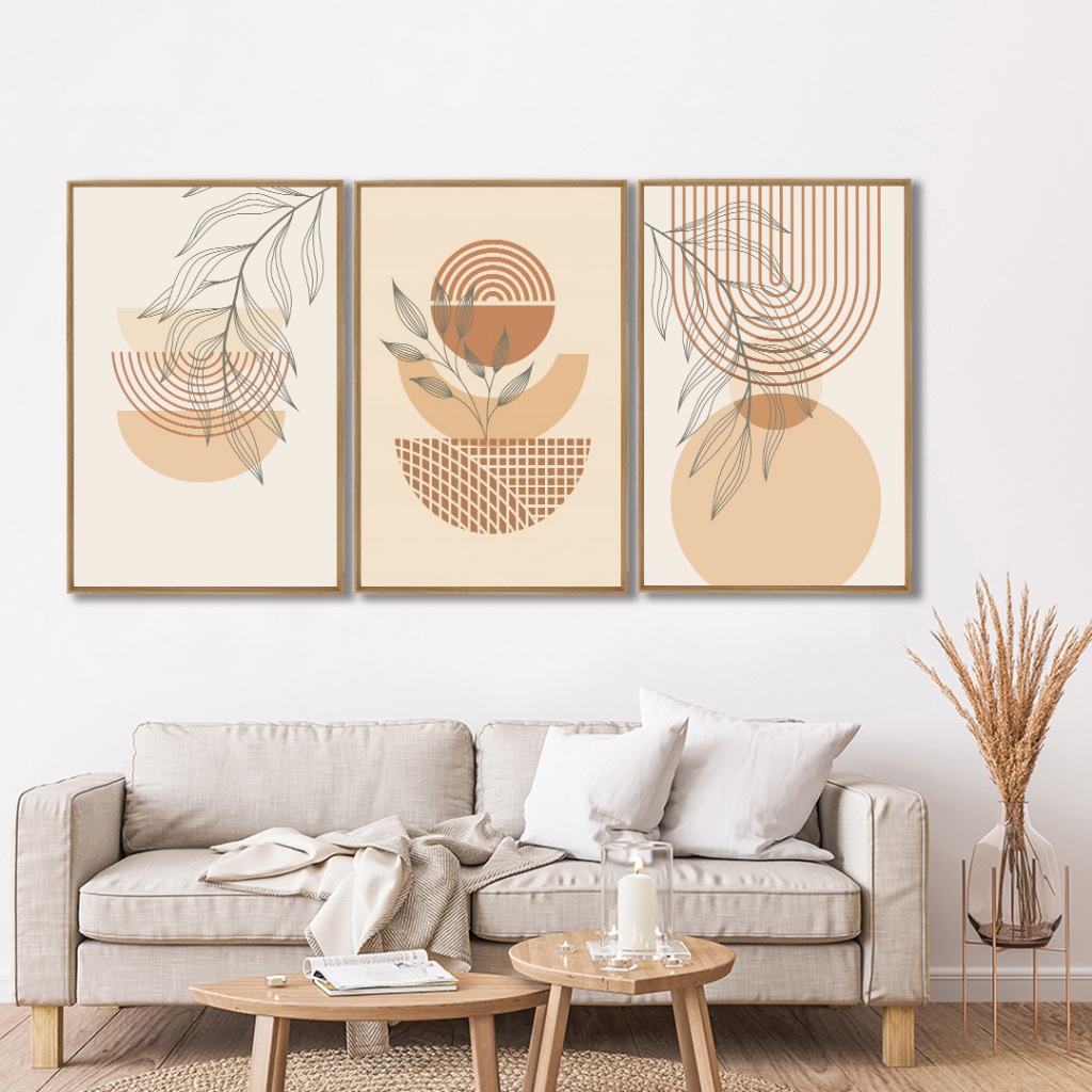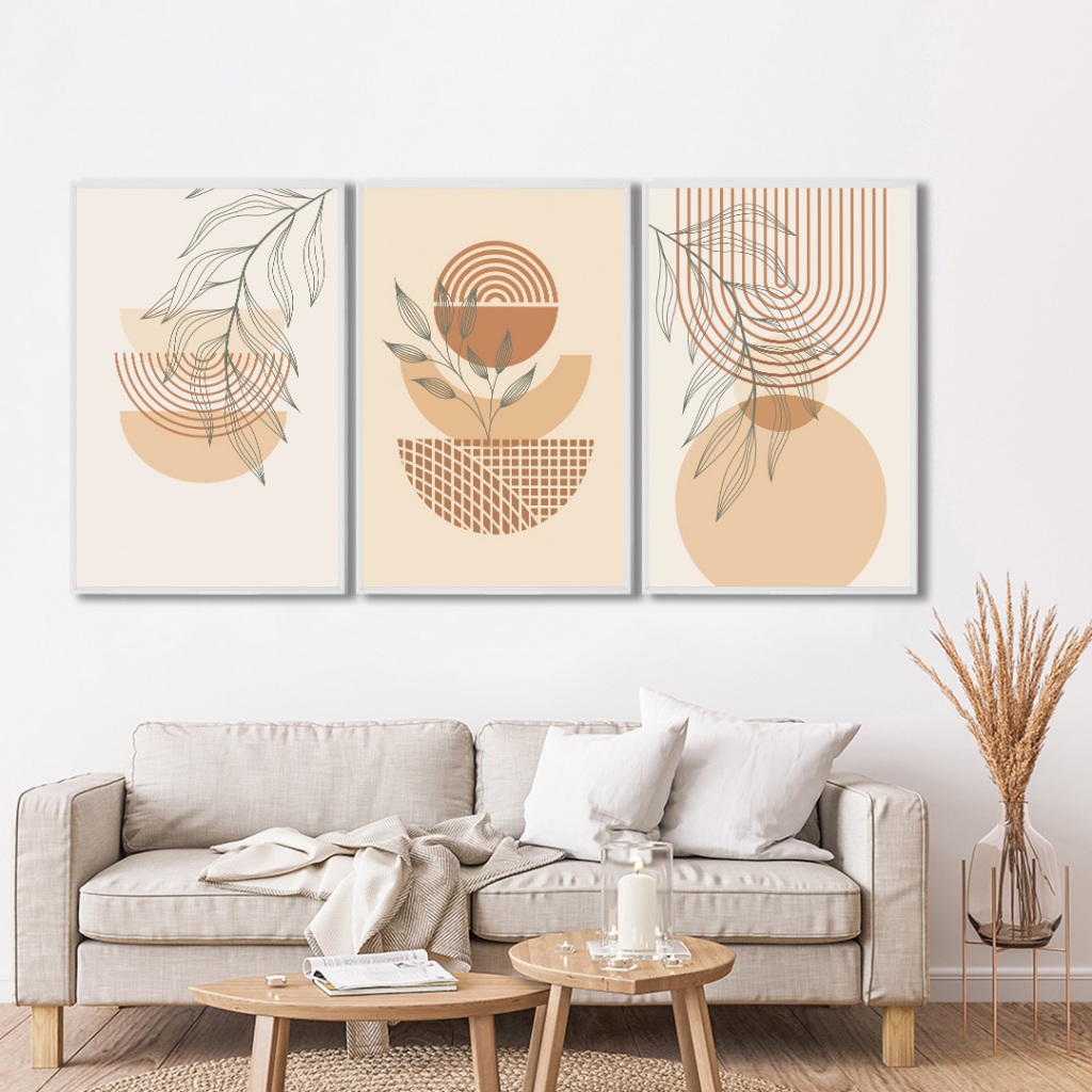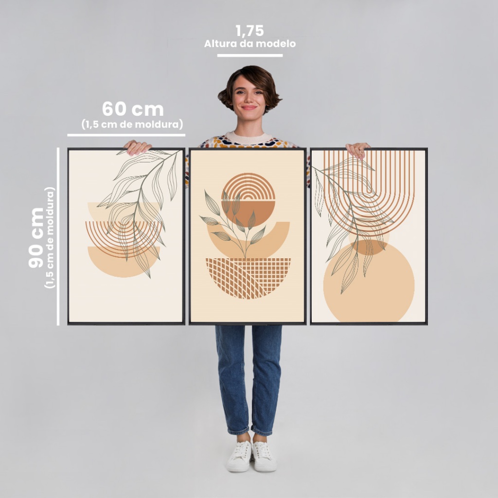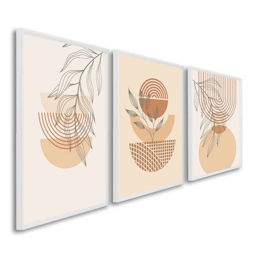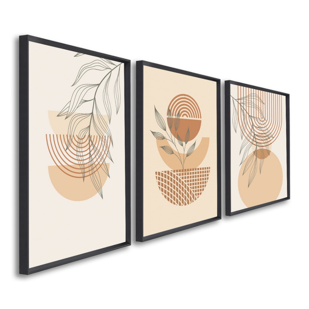3 Quadros Decorativos Boho Abstrato Arte Geométrica Botânica com Moldura