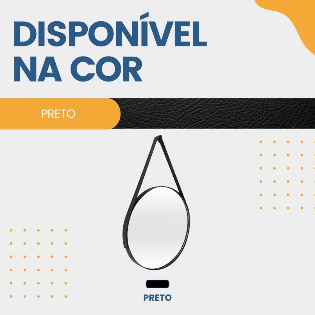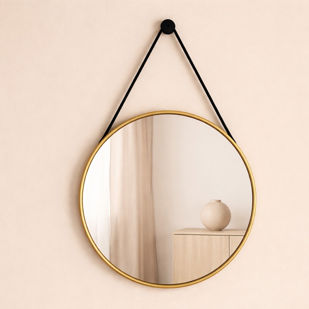 Espelho Redondo Grande 60cm com Alça em Couro +Suporte E Pendurador Para Quarto Banheiro Sala Hall