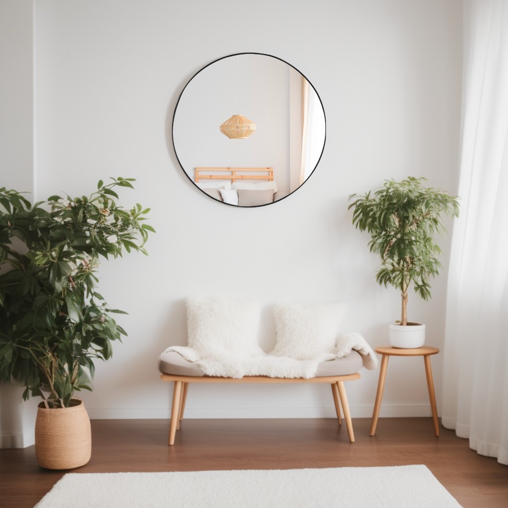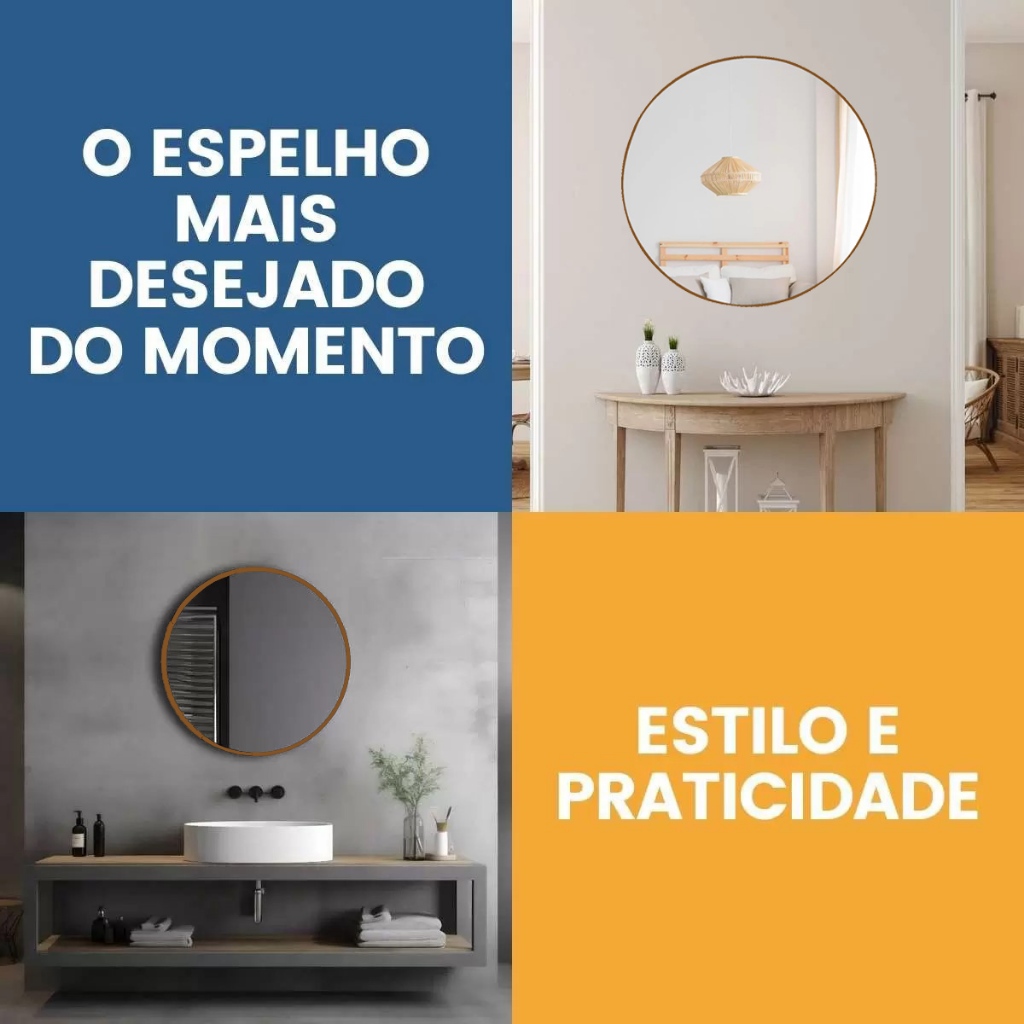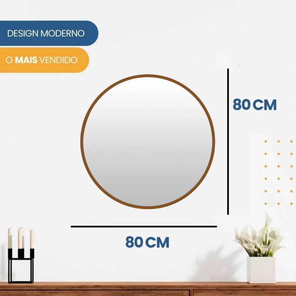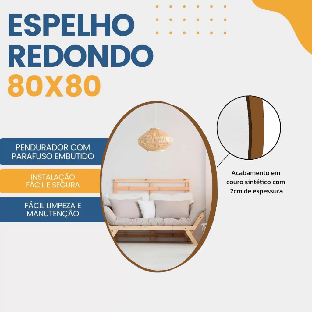 Espelho Redondo 80cm Grande Couro Suporte Sem Alça Para Banheiro Quarto Sala Decorativo