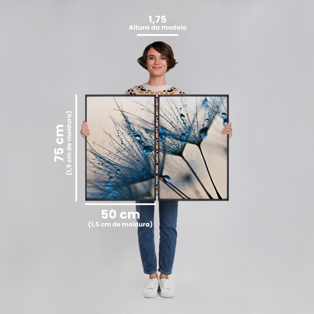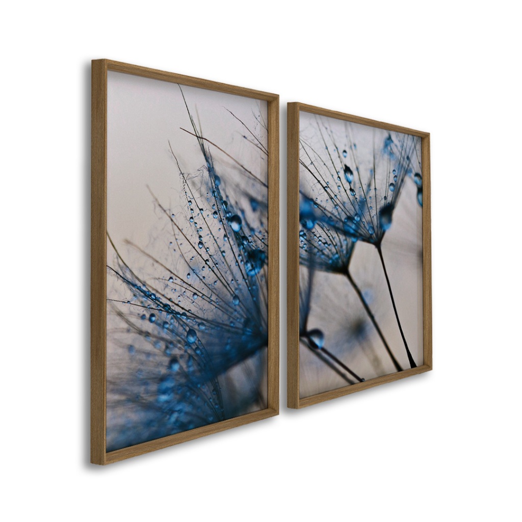 2 Quadros Decorativos Paisagem Dente de Leão Gotas de Orvalho Azul Moldura Quarto Sala Escritorio