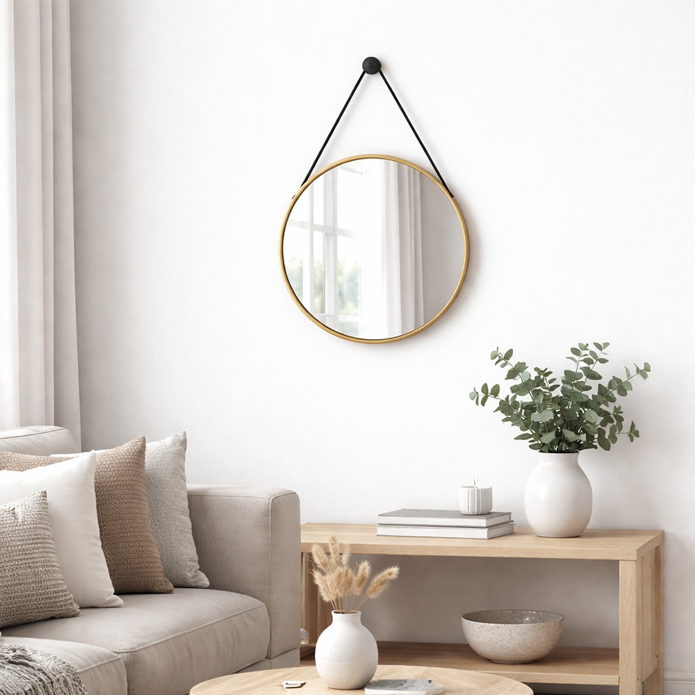 Espelho Adnet 30cm com Alça de Couro e Suporte para Banheiro Quarto Sala