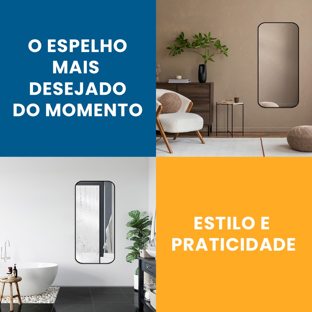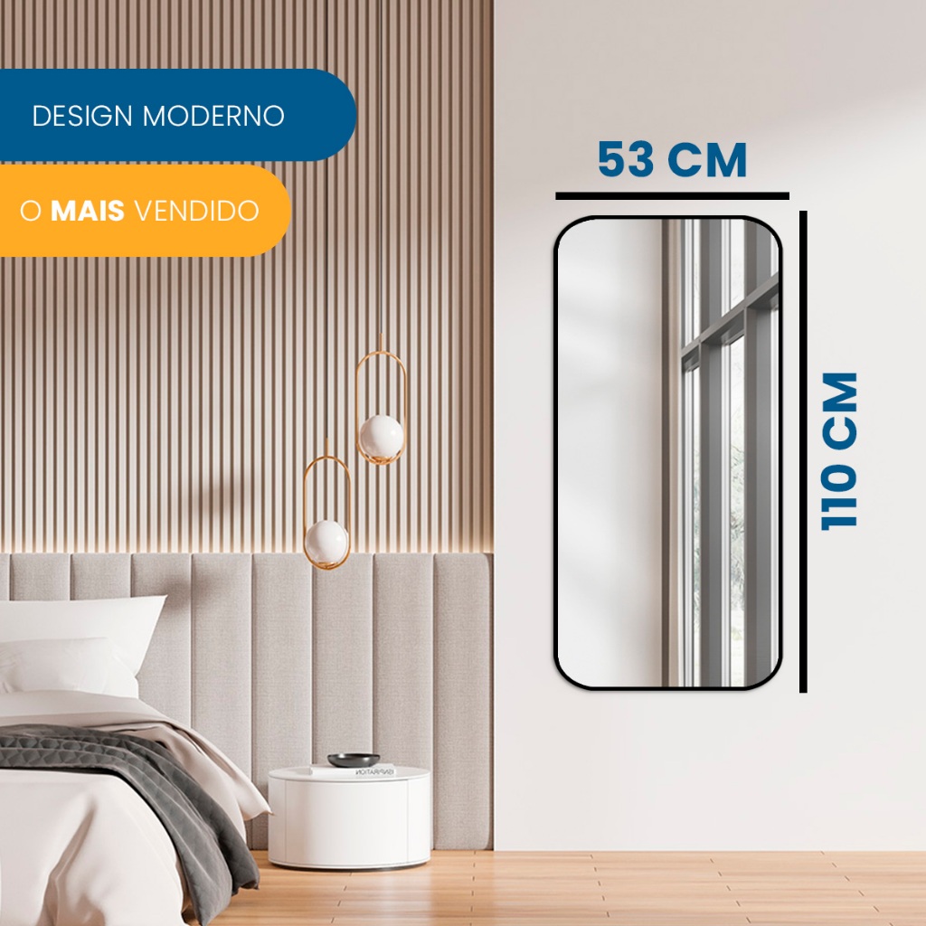 Espelho Decorativo Retangular 53x110cm com Bordas Arredondadas – Moldura Preta