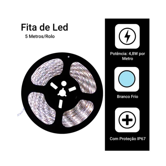Fita Led 5050 Rolo 5 Metros 300 Leds Silicone Ip65 Prova Dágua Bivolt Branco Frio Dupla Face Sem Fonte