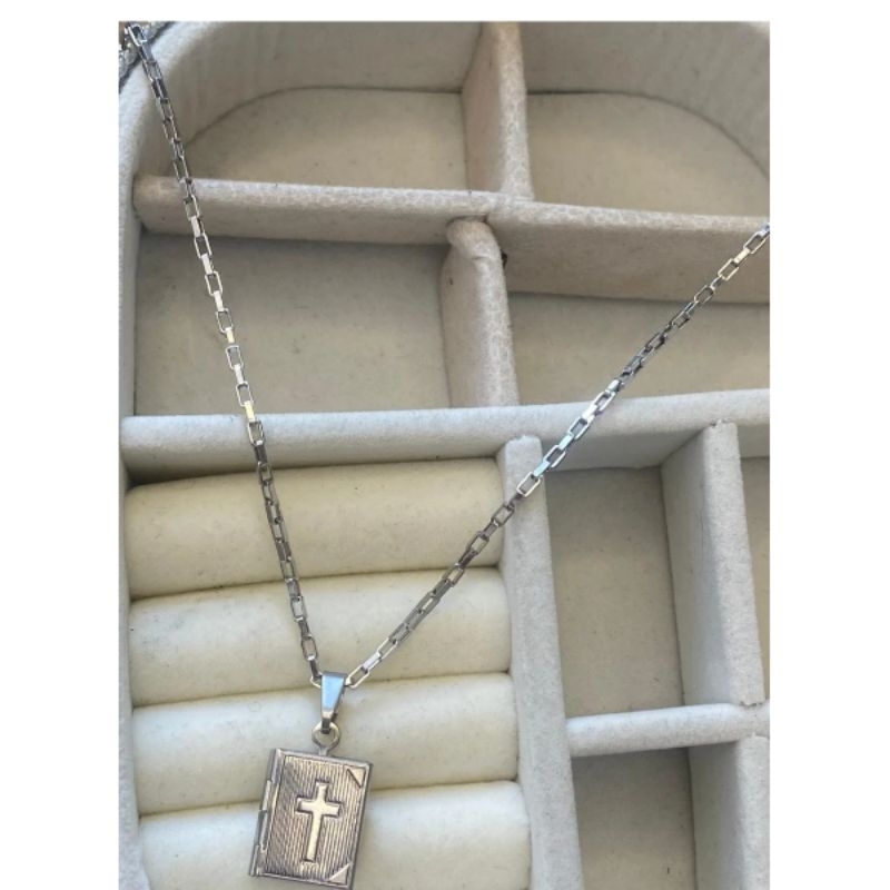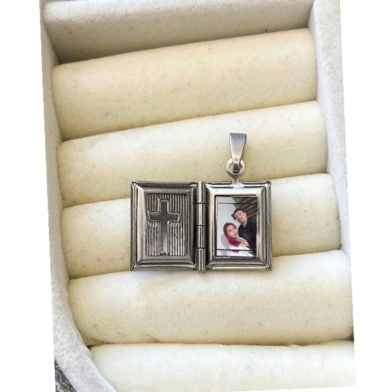 Relicário Bíblia + Corrente Cadeado em Aço Inox com 2 Fotos + Caixinha de Presente