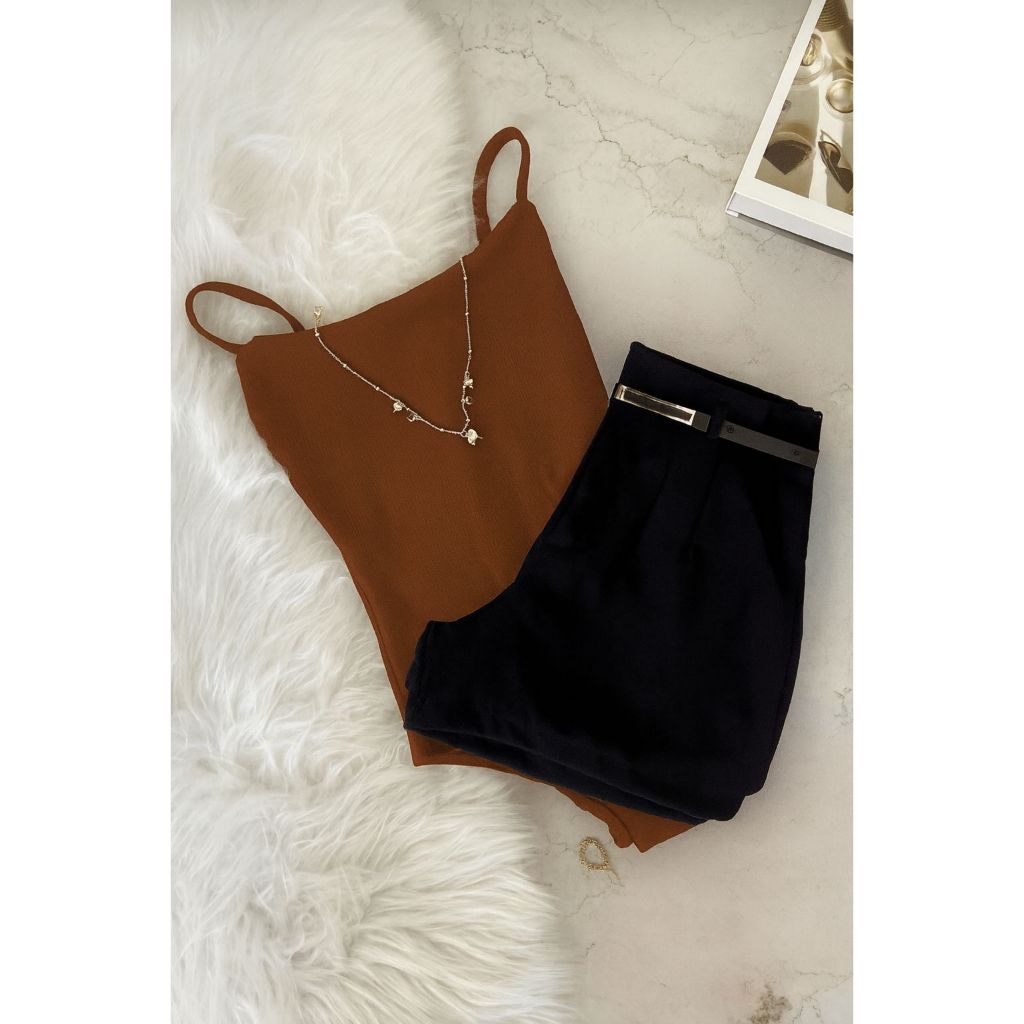 Conjunto bory body Alcinha+ Short Preto com cinto Inspiração Moda Blogueira