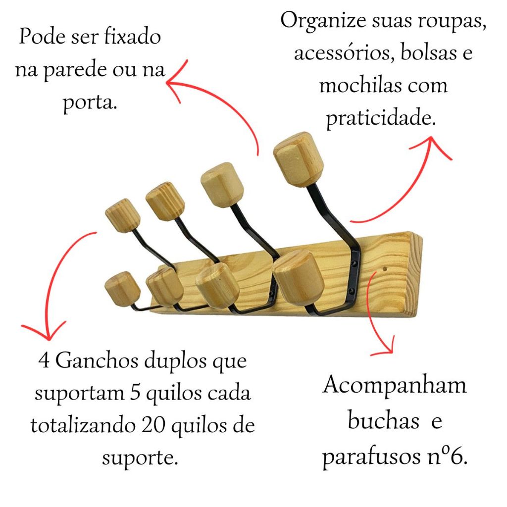 Cabideiro De Parede em Madeira 4 Ganchos vintage, cabide organizador para sala, quarto e casa.