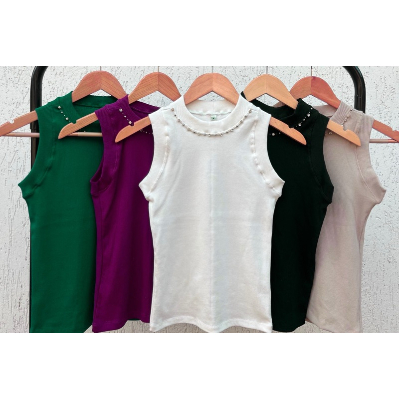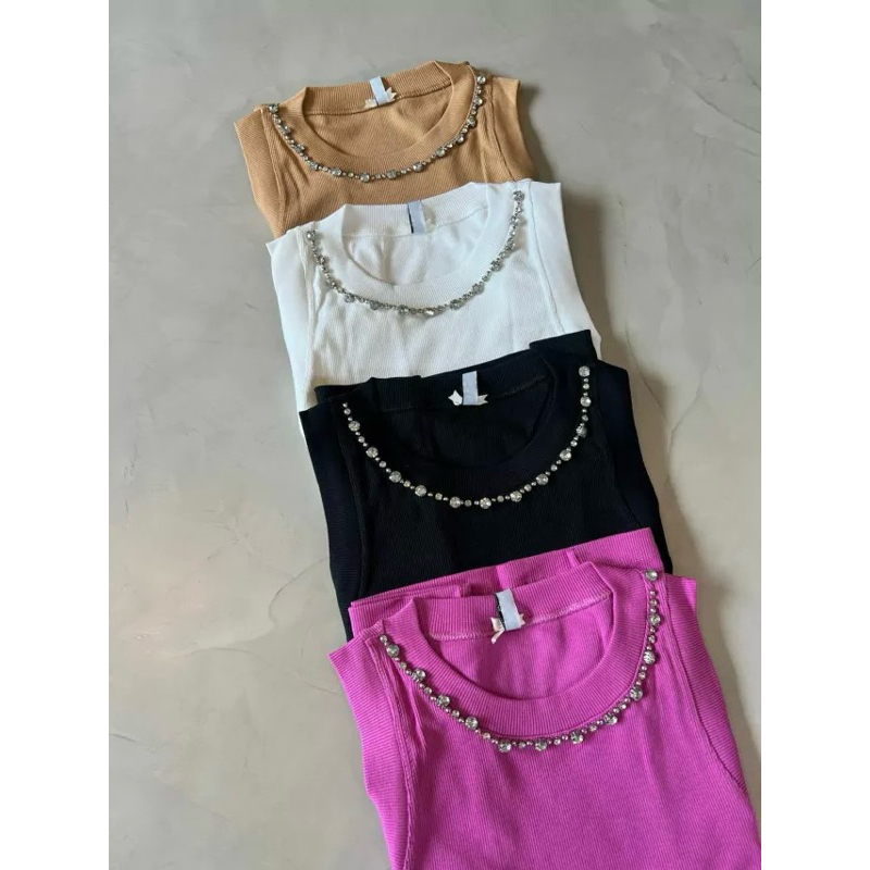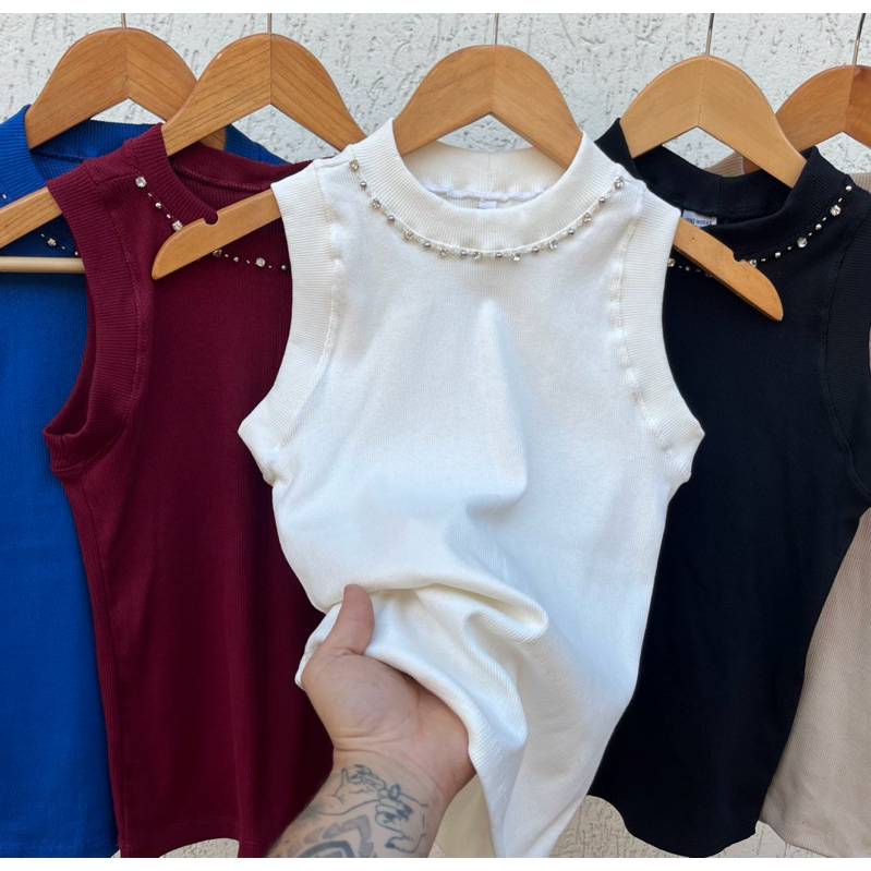 Regata Canelada Feminina Com Detalhe em Pedraria Bordada à Mão TShirt Bordada com Strass