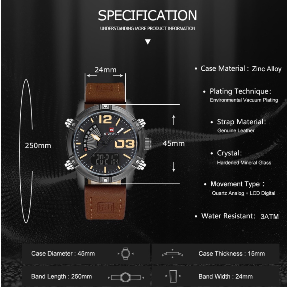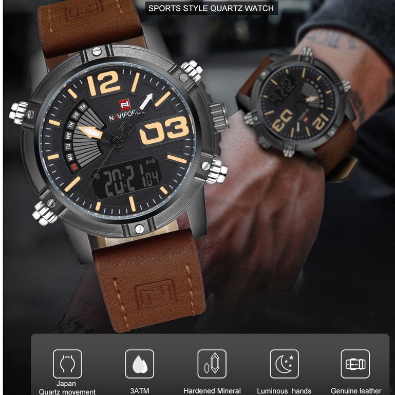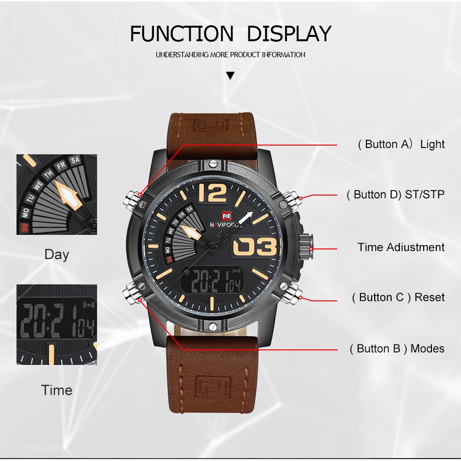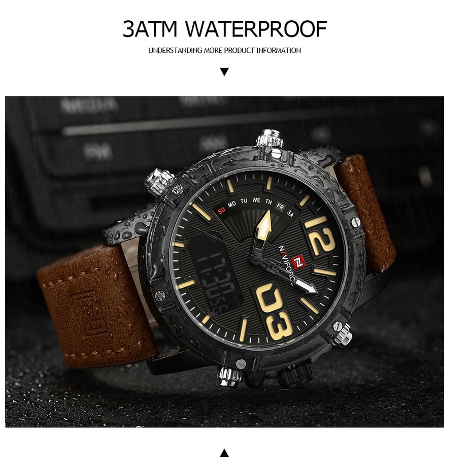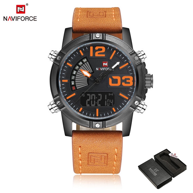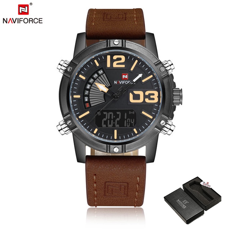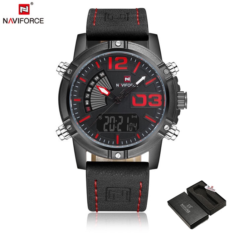 Naviforce 9095 Relógios De Moda Analógicos De Dupla Exibição De Quartzo À Prova D'água Masculinos De Couro