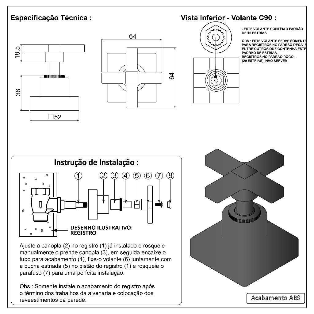 Acabamento Registro Preto Black Padrão Deca Pressão E Gaveta 16 Estrias Abs
