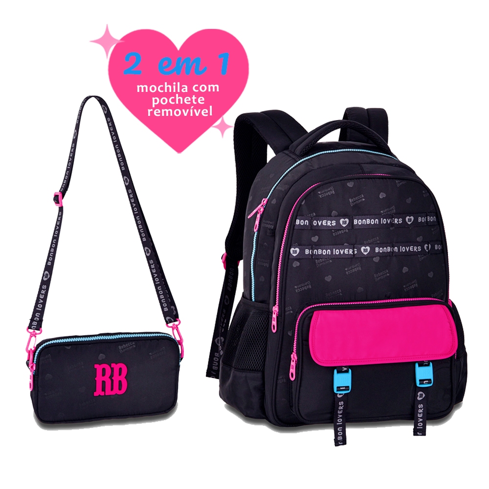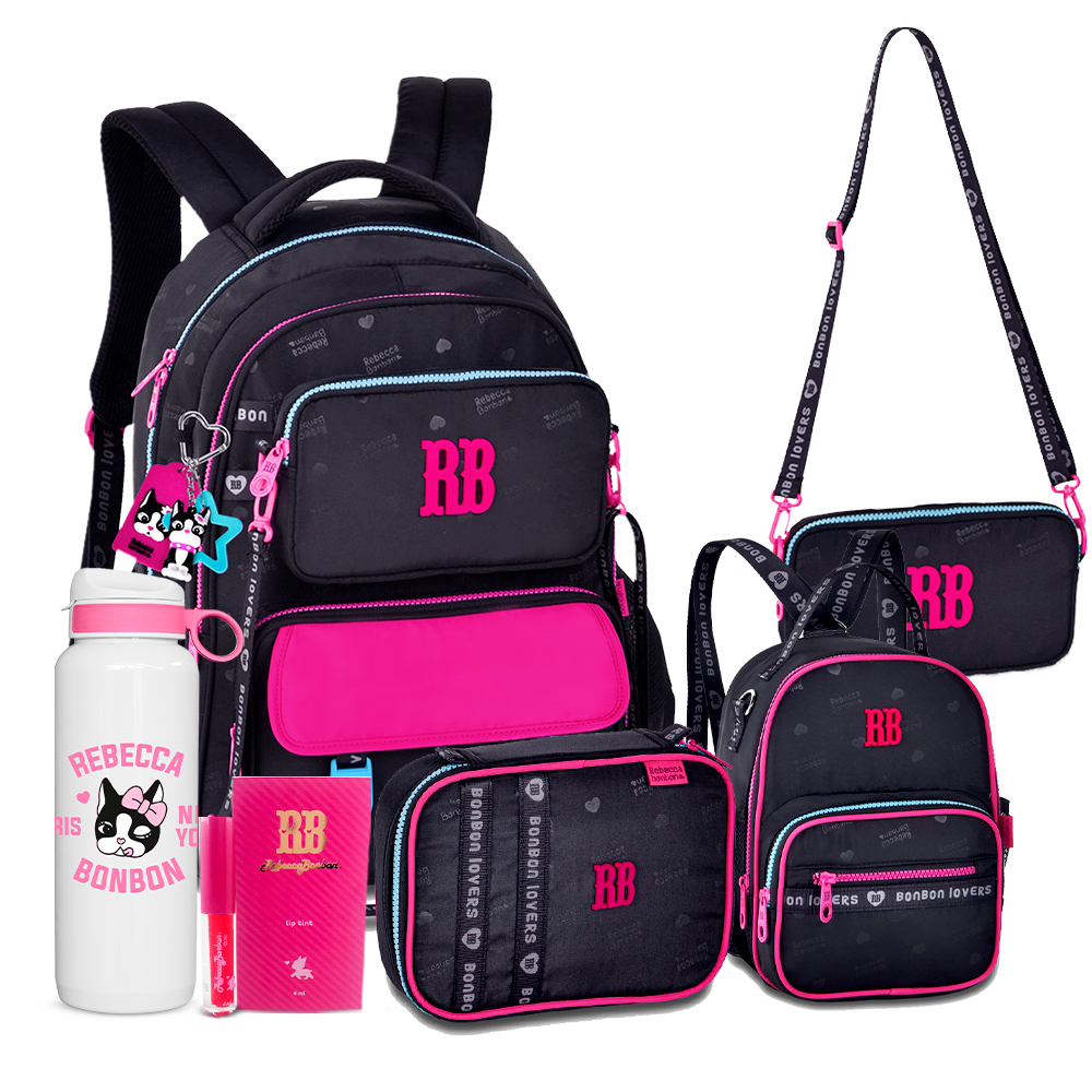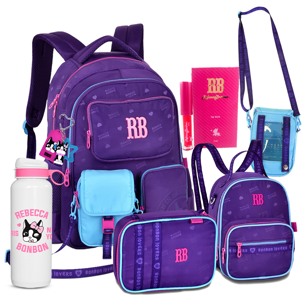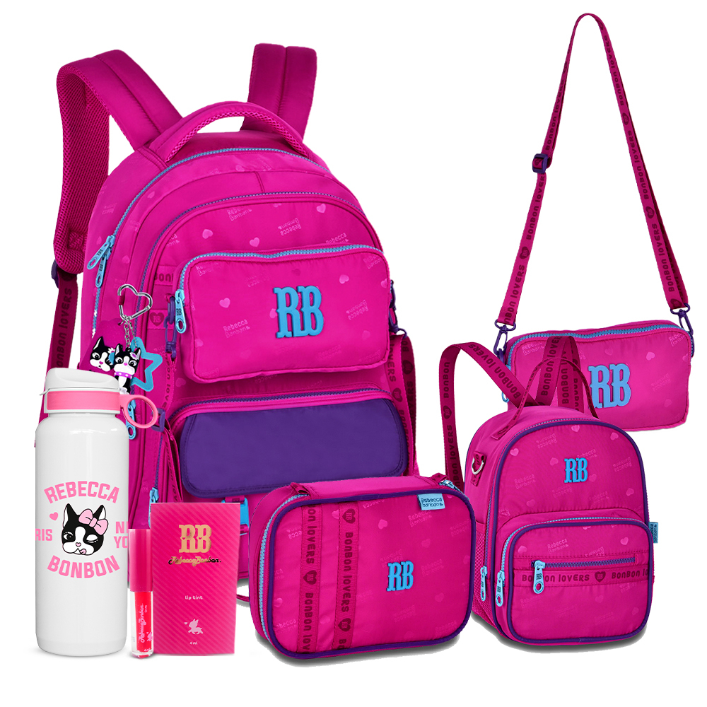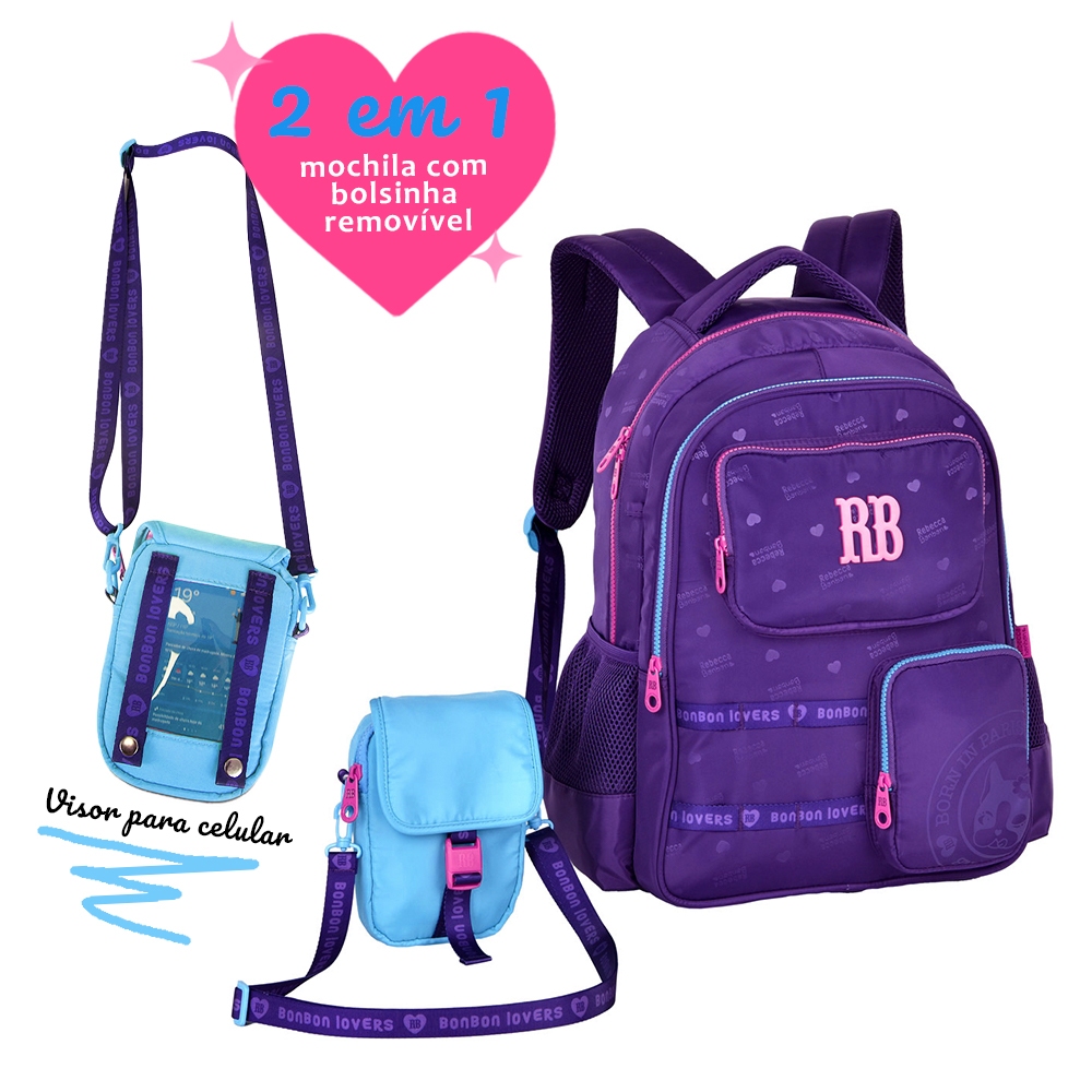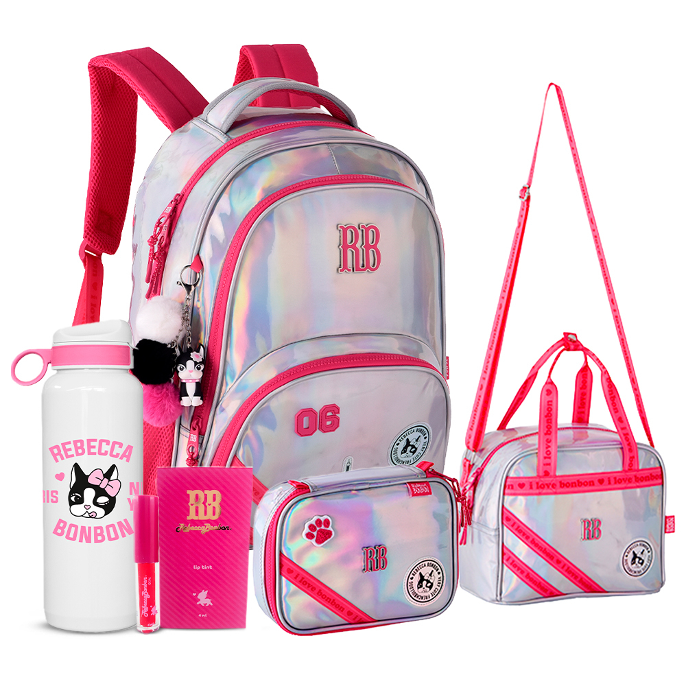 Kit Mochila Costas Soft Bolsinha Lancheira Alça 2 em 1 Estojo Box Rebecca Bonbon RB Metalizado