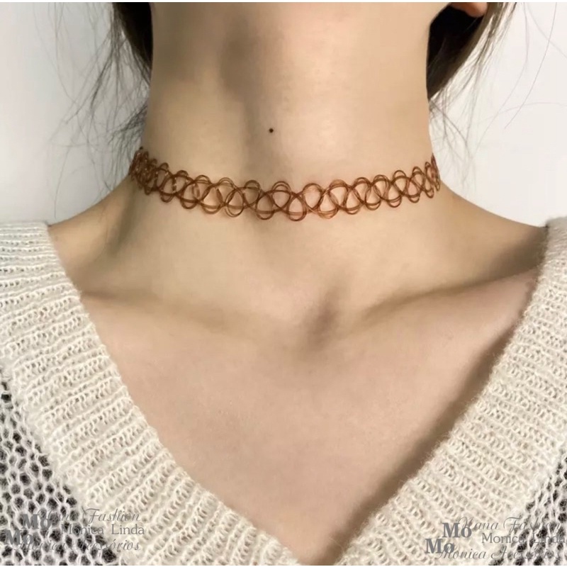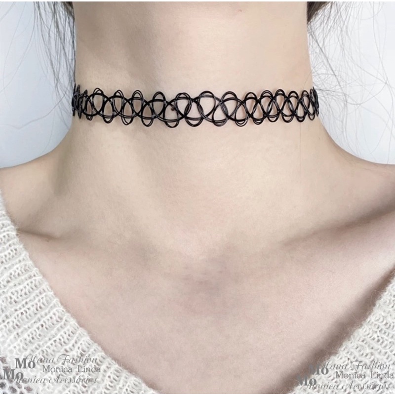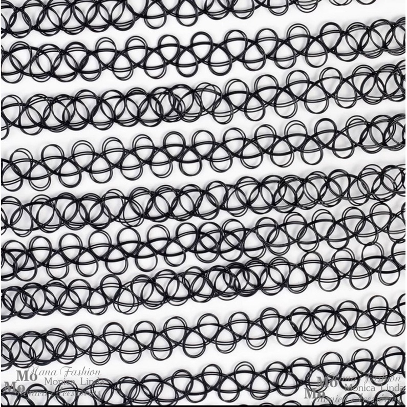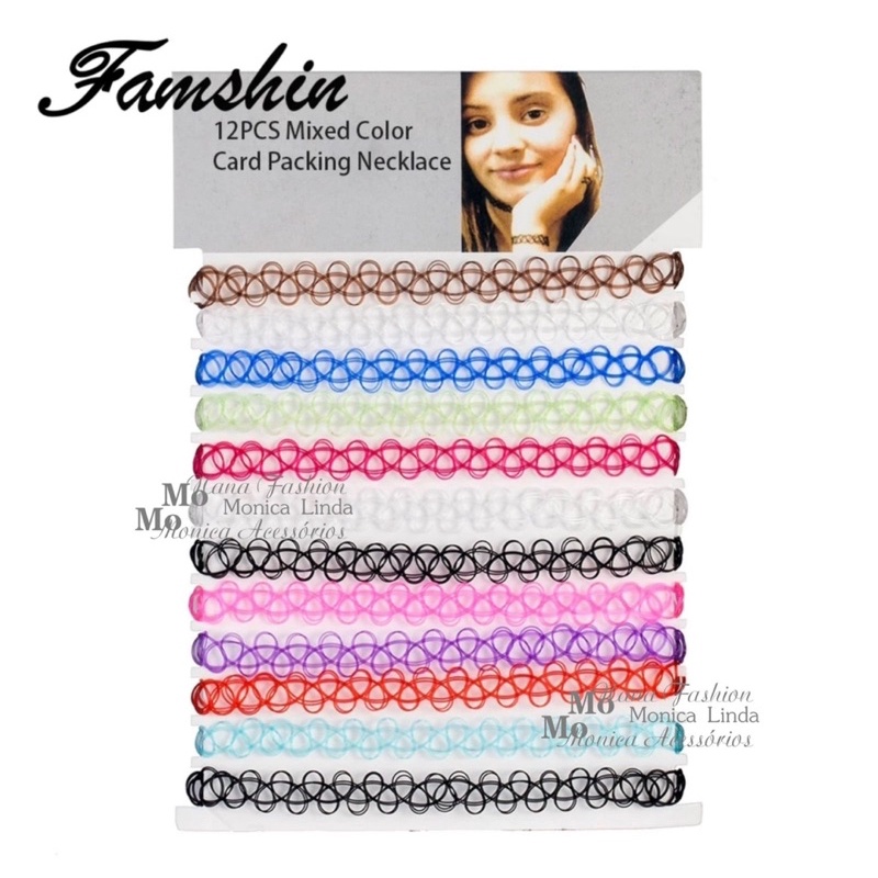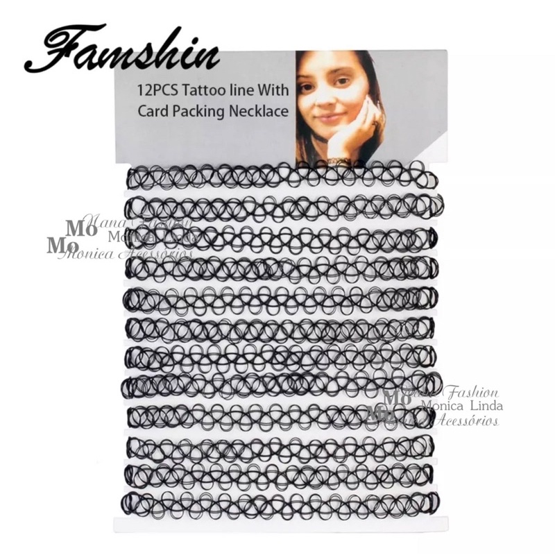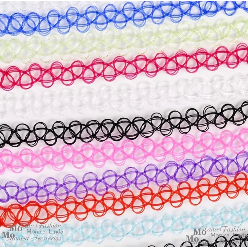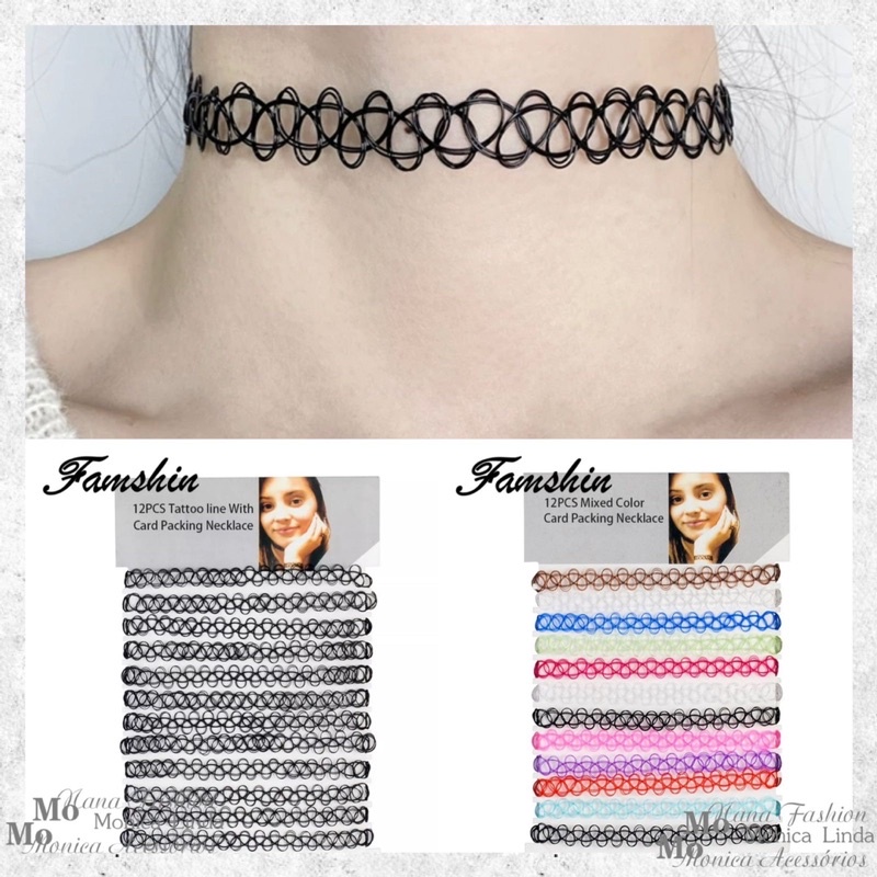 Kit 12 Gargantilha Colar Choker Coleira Tipo Tattoo De Nylon Preta/Colorido