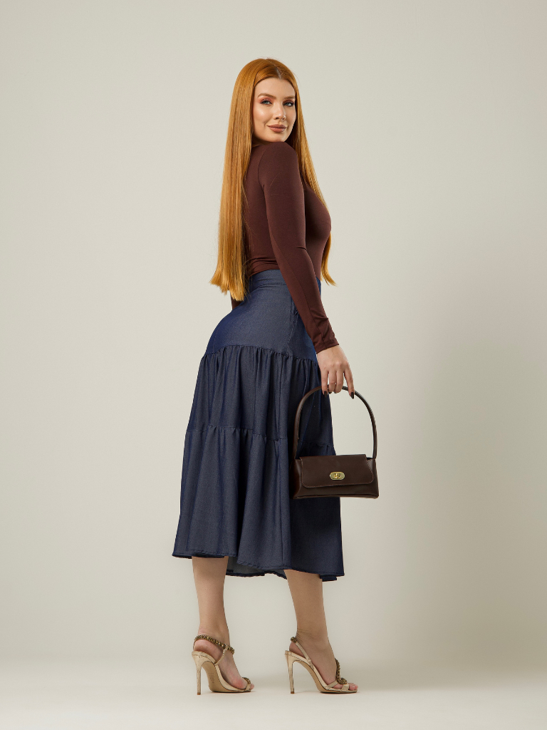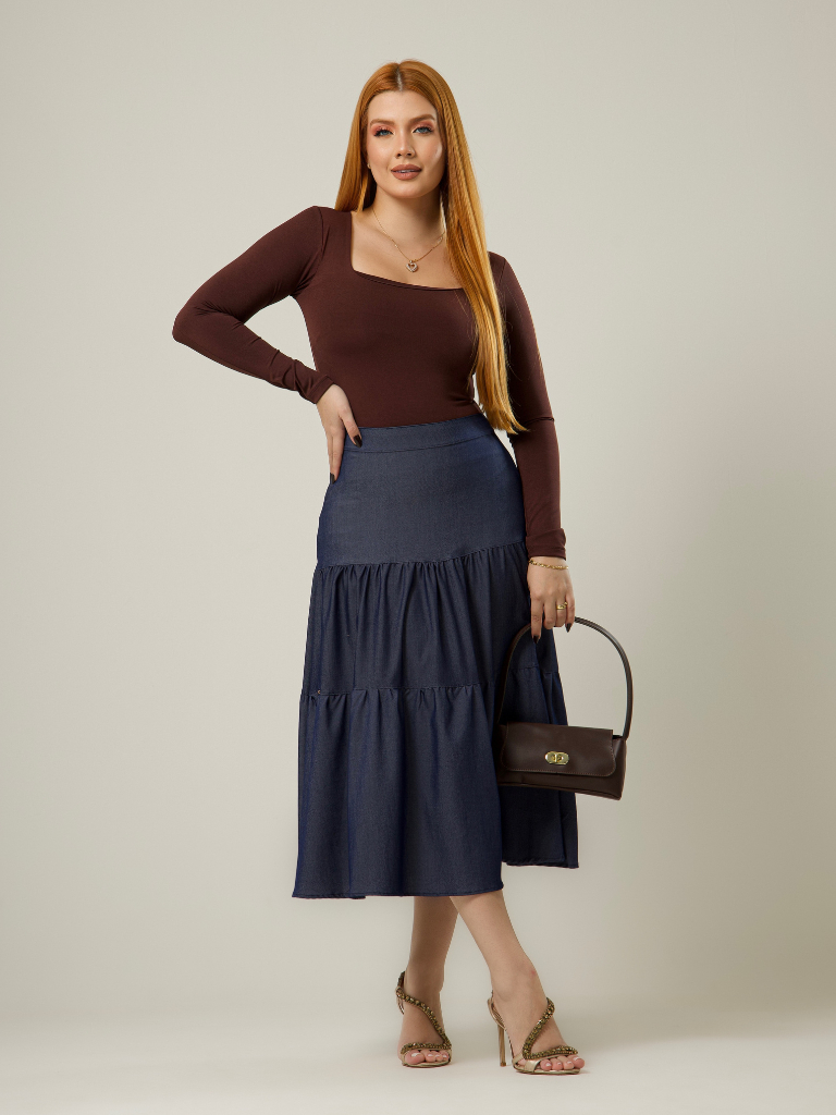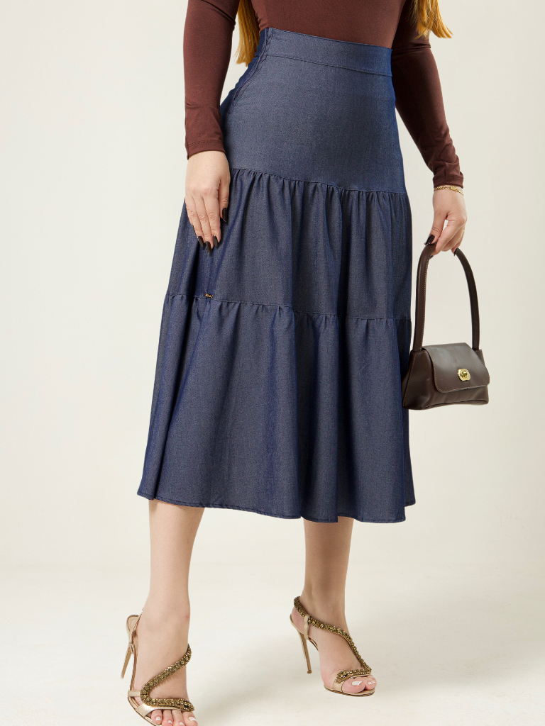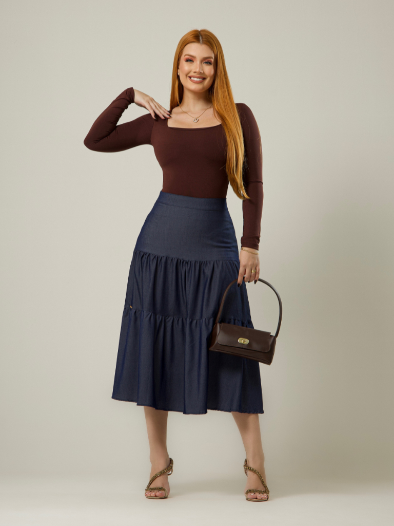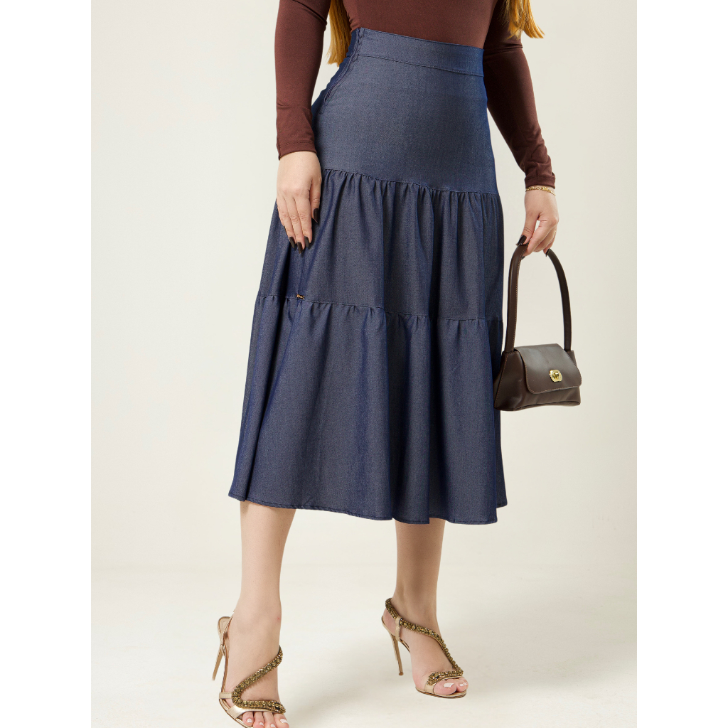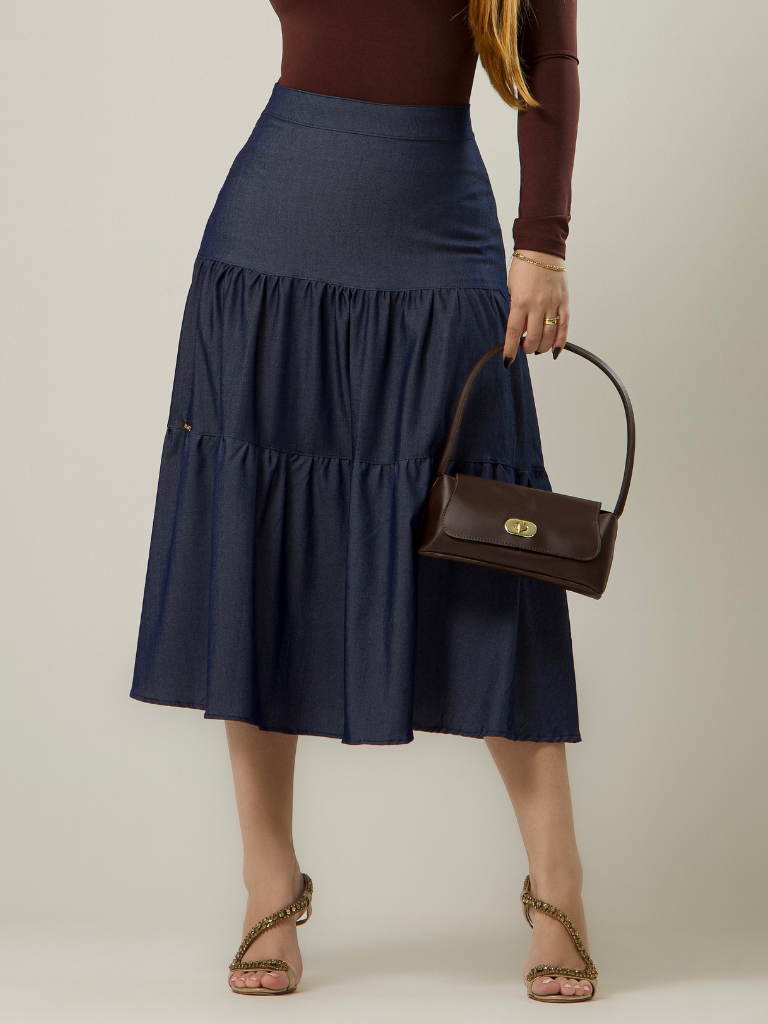Saia Feminina Jeans Tencel Leve Três Marias Rodada Solta Midi Longuete Cintura Alta Elegante Dorameira Moda Evangélica
