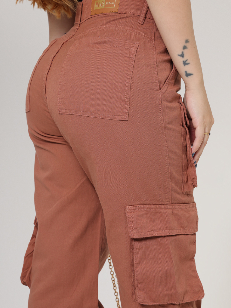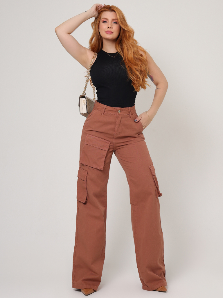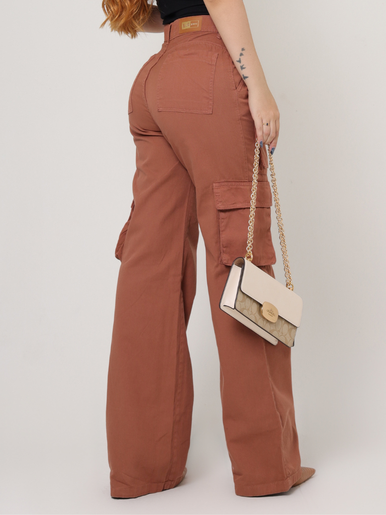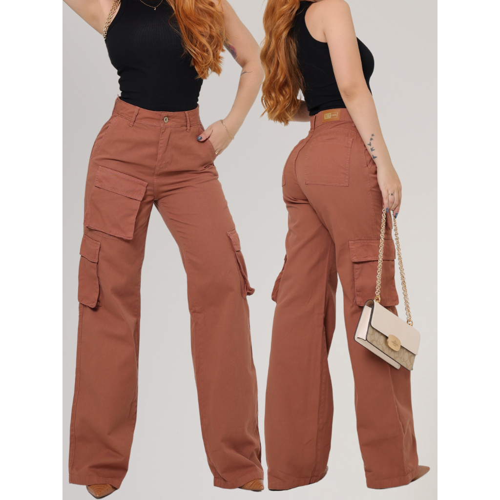 Calça Cargo Feminina 100% Algodão Bolsos Perna Larga Cintura Alta Empina Bumbum Marrom Wide Leg Pantalona Moda Street