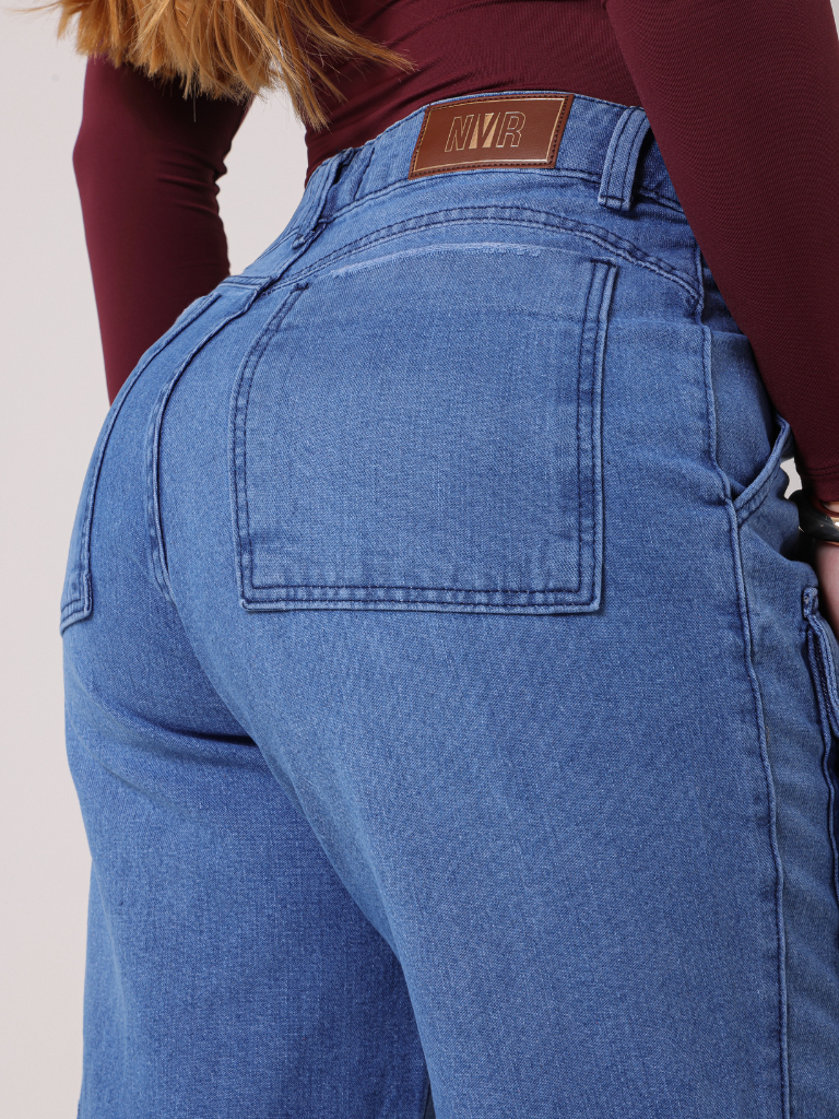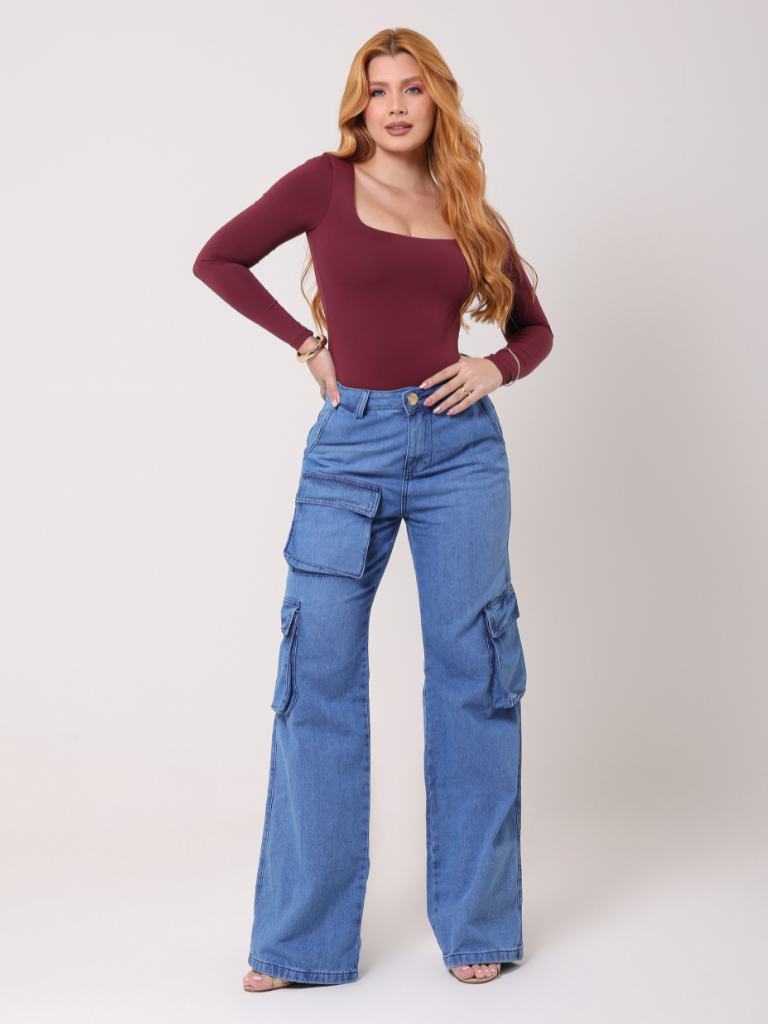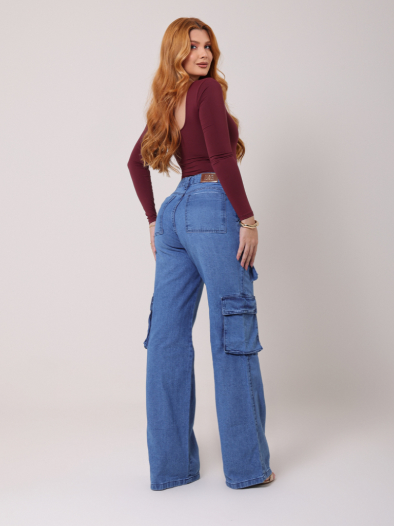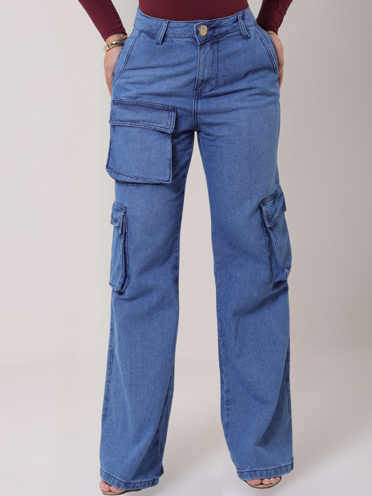 Calça Cargo Feminina 100% Algodão Bolsos Perna Larga Cintura Alta Empina Bumbum Marrom Wide Leg Pantalona Moda Street