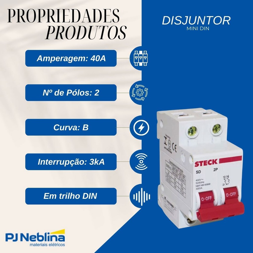 Disjuntor Mini Din Bipolar 40A Curva B SDD62B40 Steck