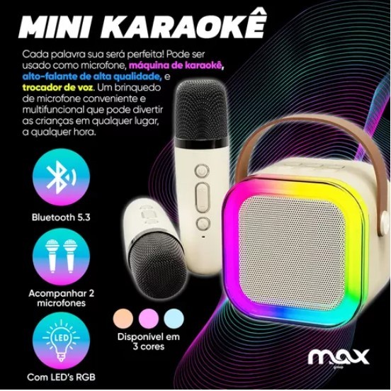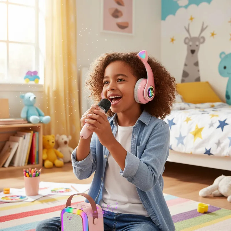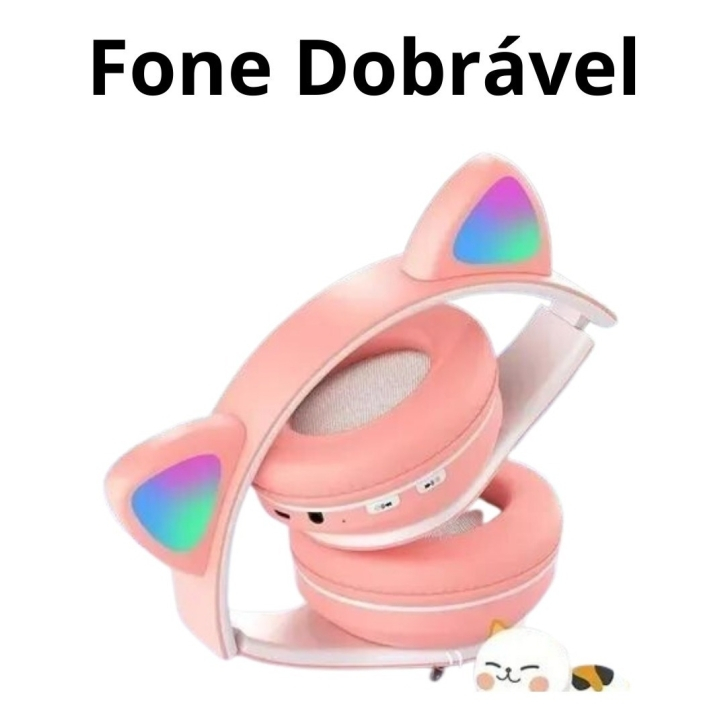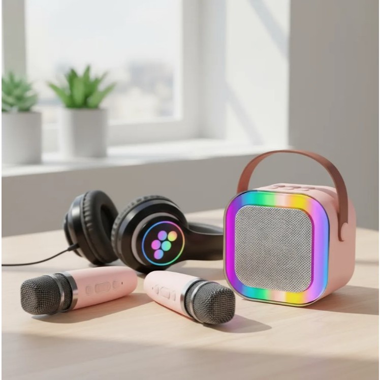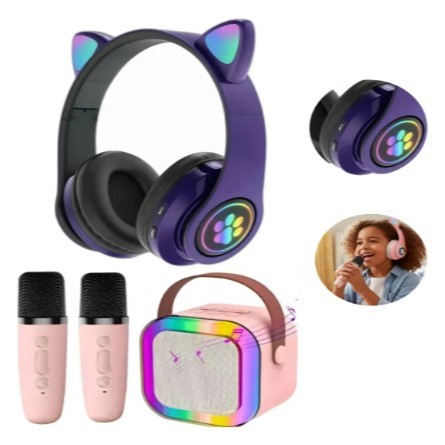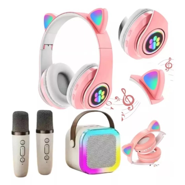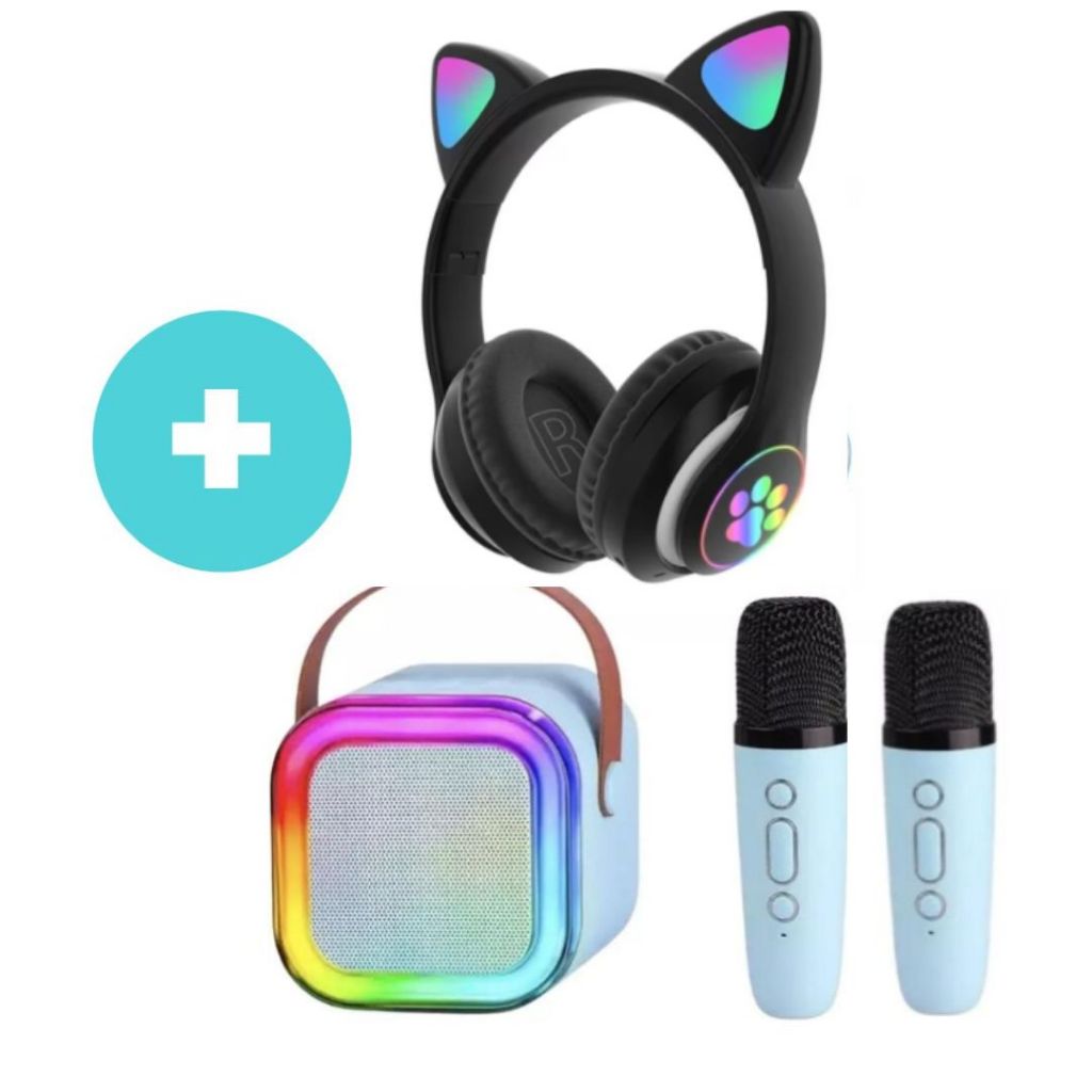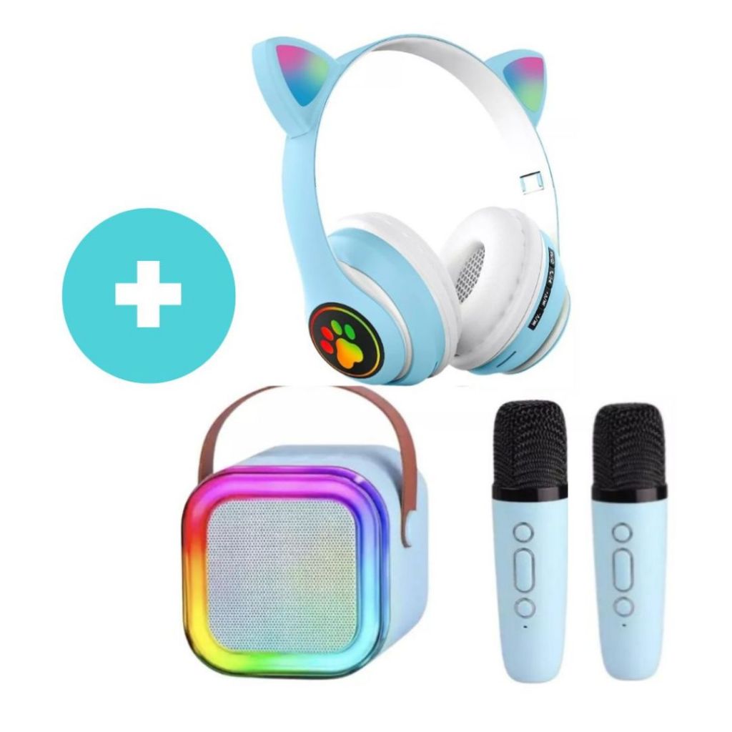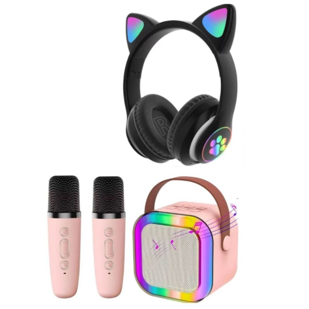 Fone Gatinho Infantil + Caixa De Som Karaokê Com 2 Microfone