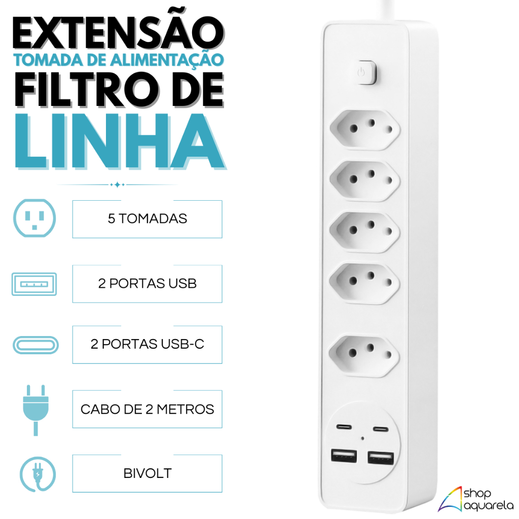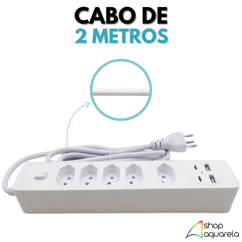 Filtro de Linha 2 Metros Inova 5 Tomadas 2 USB 2 USB-C Bivolt Potência Segurança