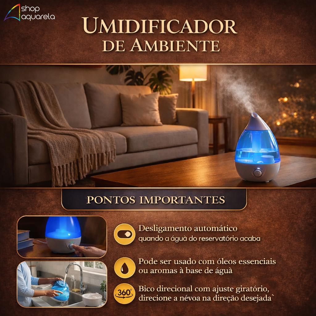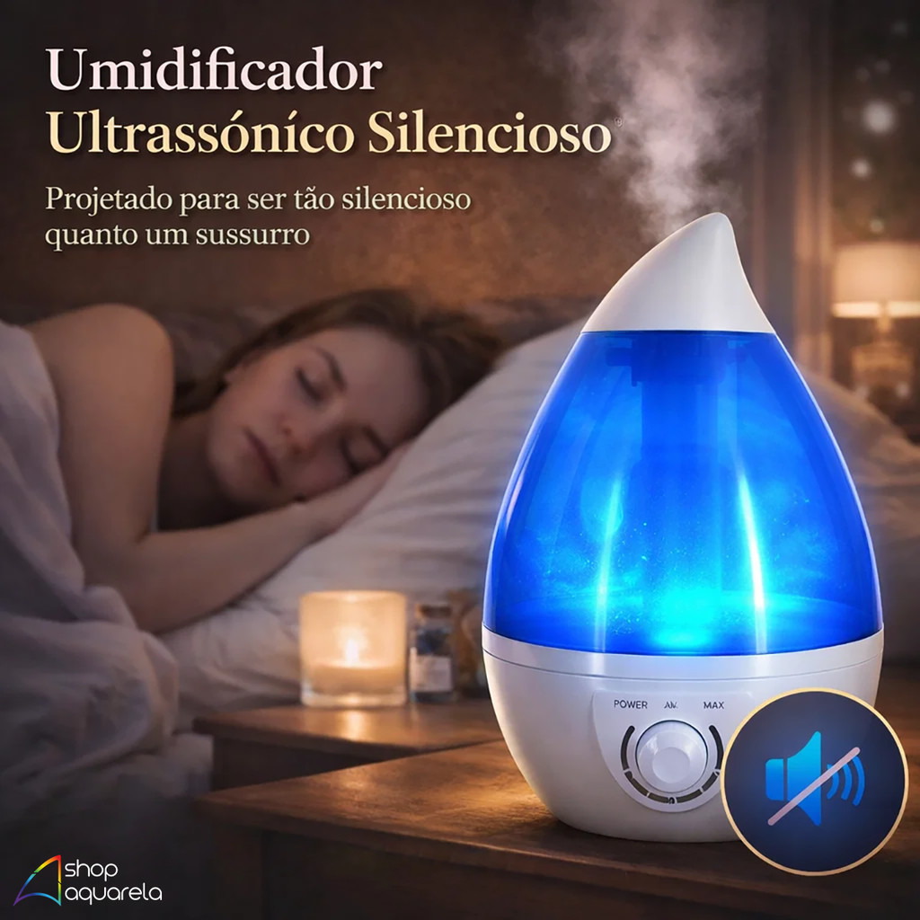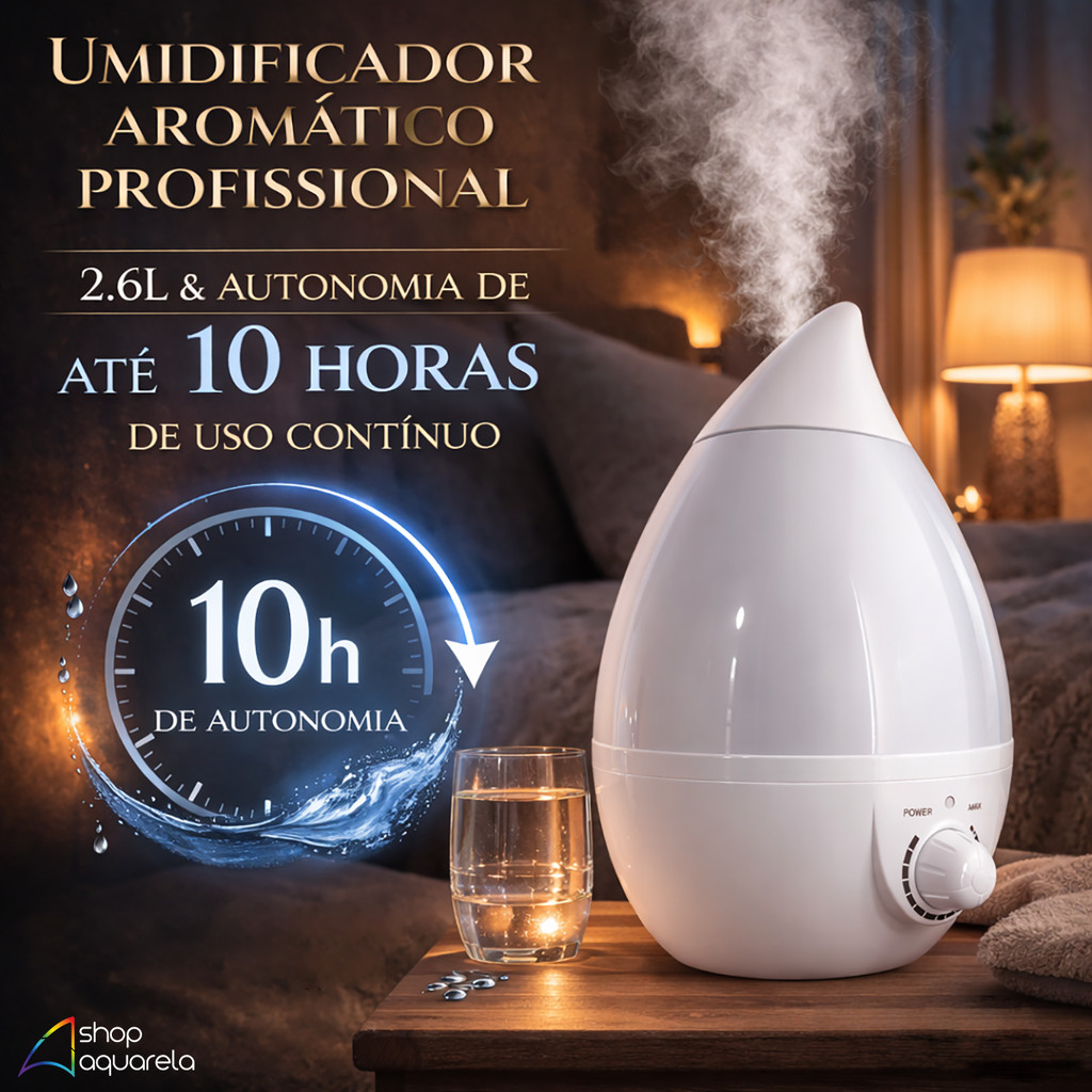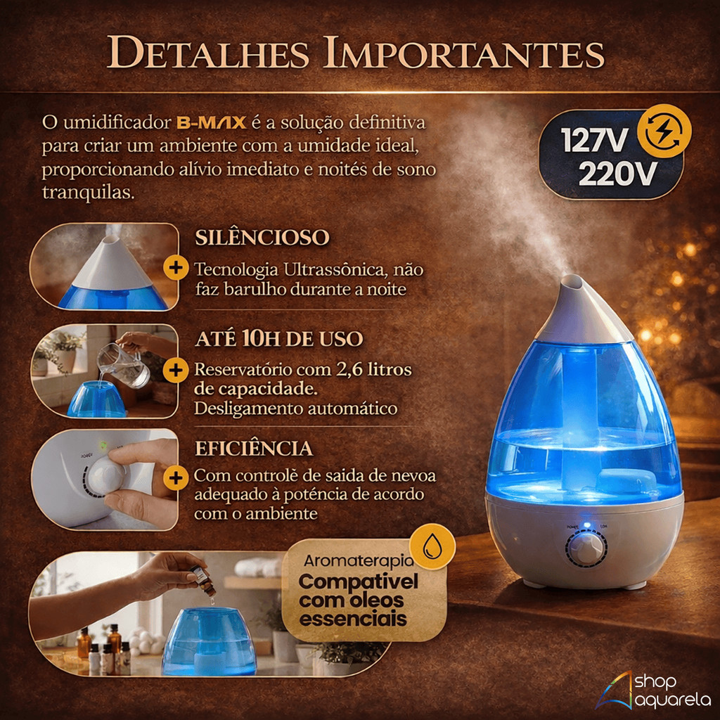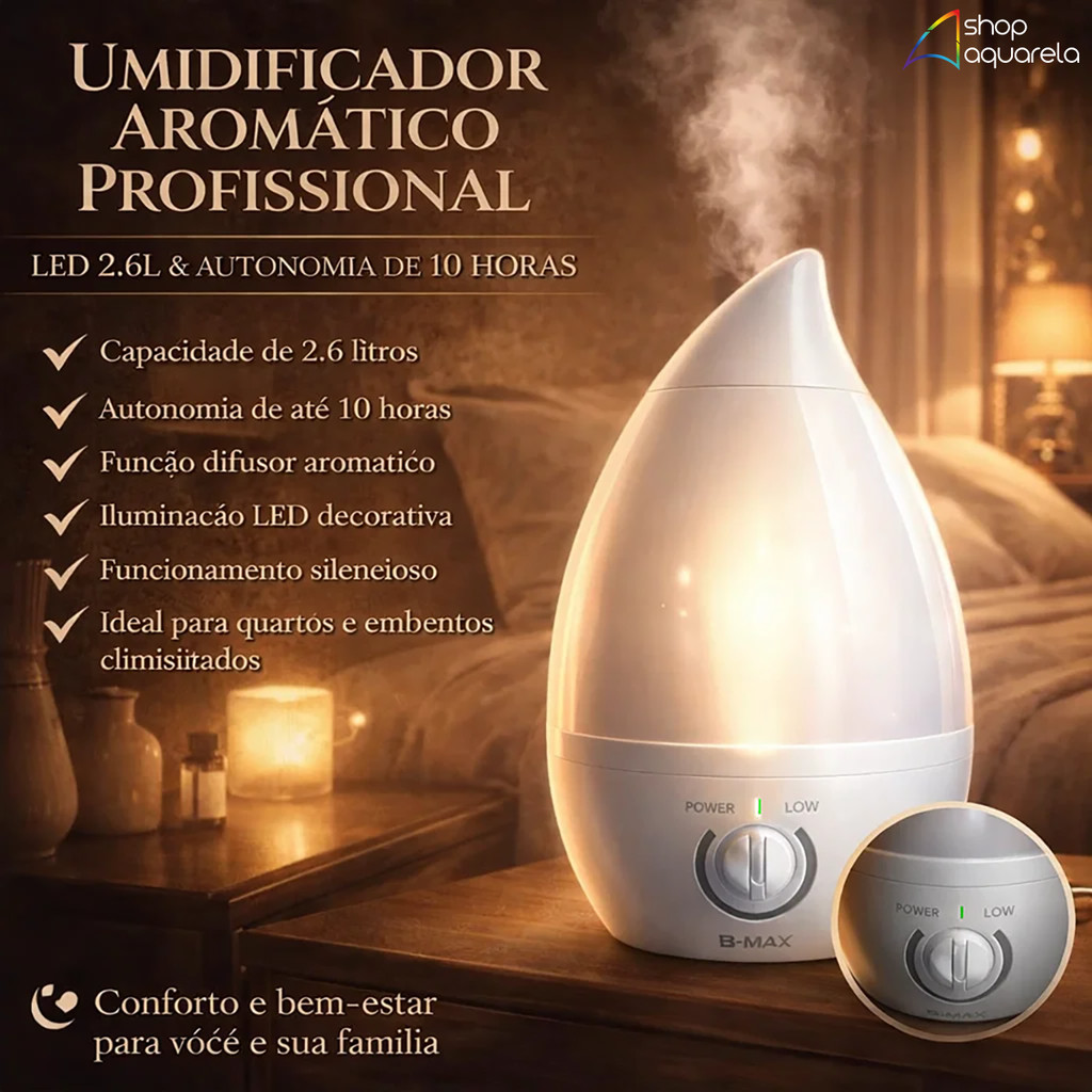 Umidificador de Ar 2.6L Difusor Aromático LED Silencioso Bivolt BMax 10h Autonomia