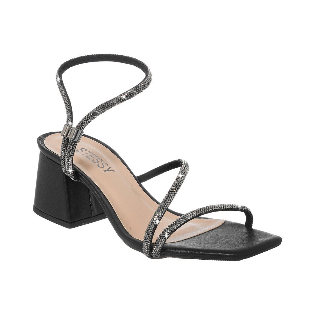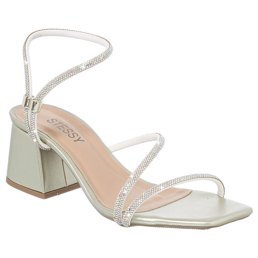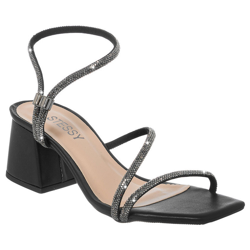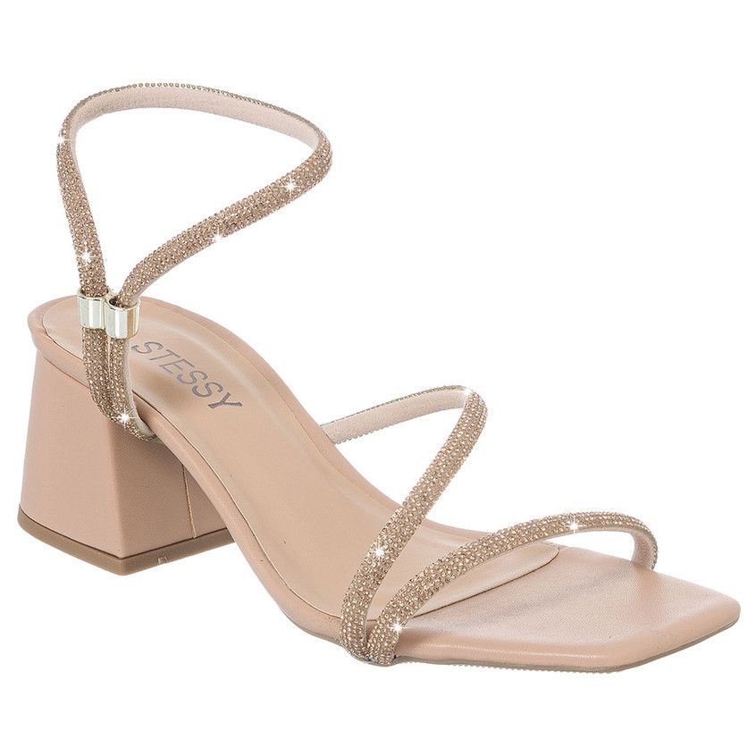 Sandália Feminina Stessy Shoes Salto Alto Bloco Strass Brilho Calce Fácil Confortável Festa