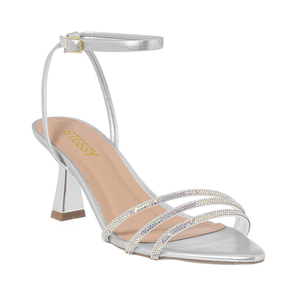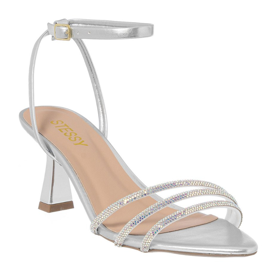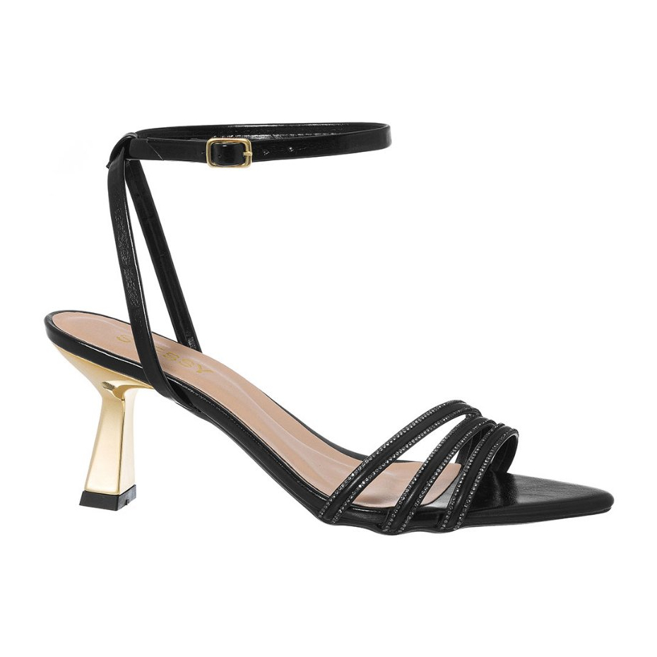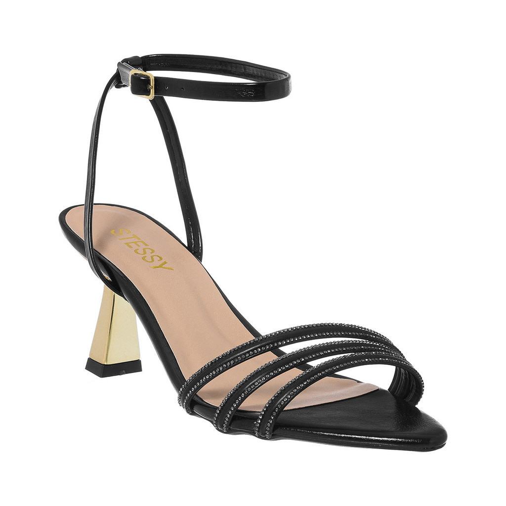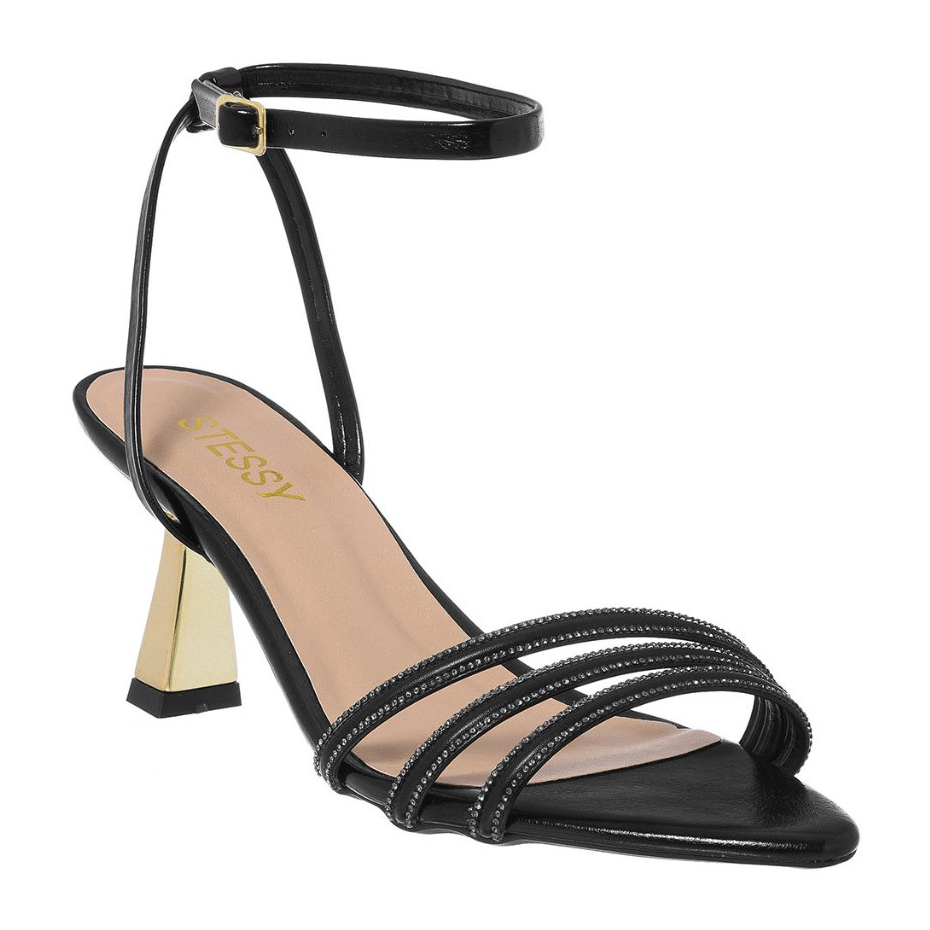 Sandália Feminina Stessy Bico Folha Salto Dourado Metalizado Strass Luxo Festa Confortável Elegante