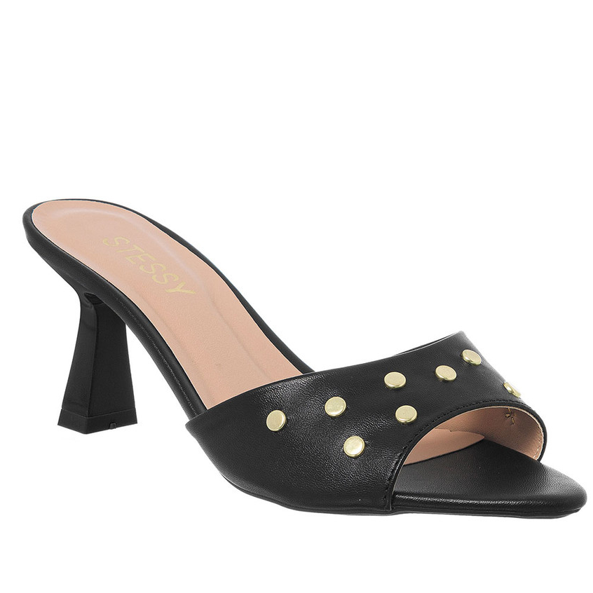 Tamanco Stessy Sandália Feminina Mule Bico Folha Tachas Salto Alto Elegante Confortável Leve Moda