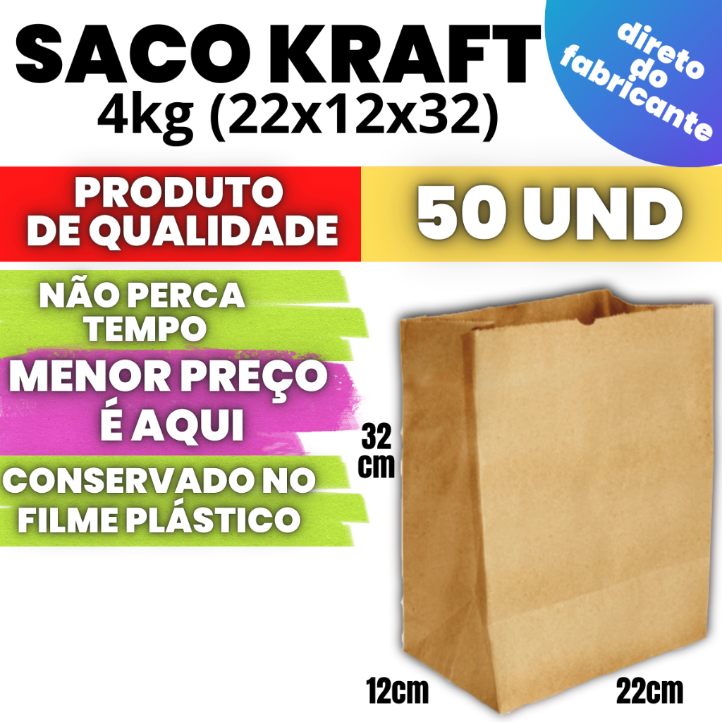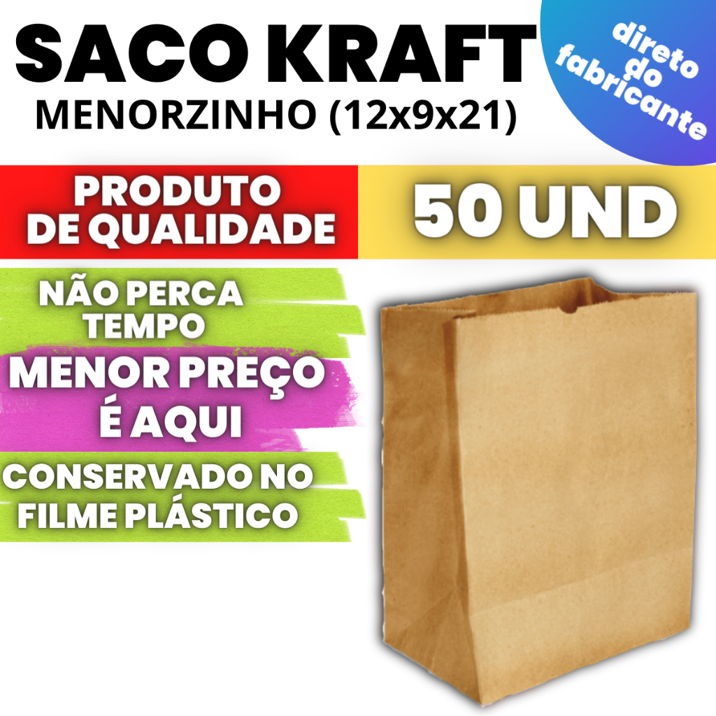 Saco Kraft Embalagem de Papel Craft Para Delivery com 50 und Escolha o Seu Tamanho
