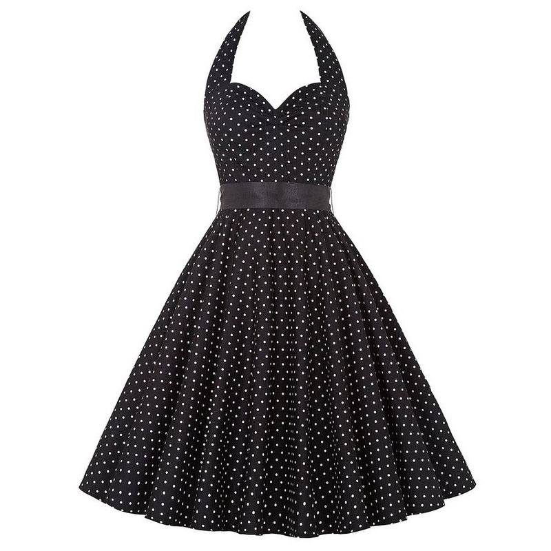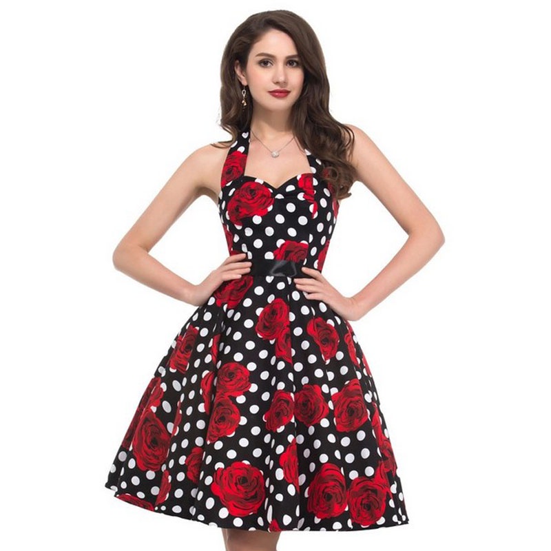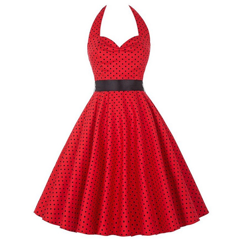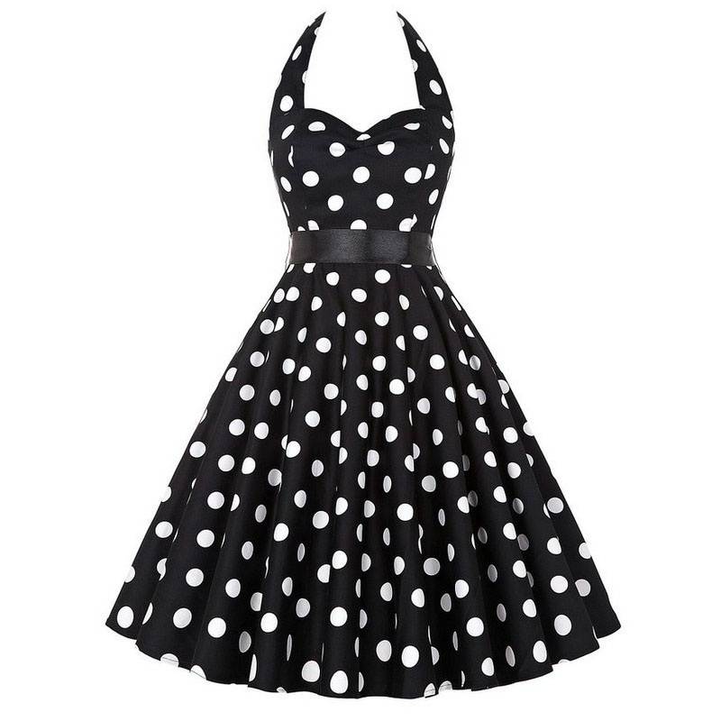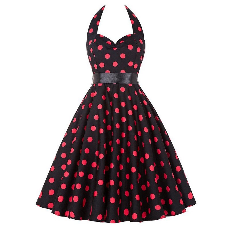 Vestido Feminino De Cabresto De Pescoço Polka Dot Print Uma Linha Vintage Midi Com Cinto