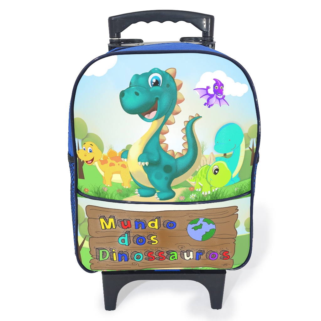 Kit Escolar Menino Infantil Mochila de Rodinha Mundo dos Dinossauros Azul, Estojo 1 Ziper e Lancheira Térmica