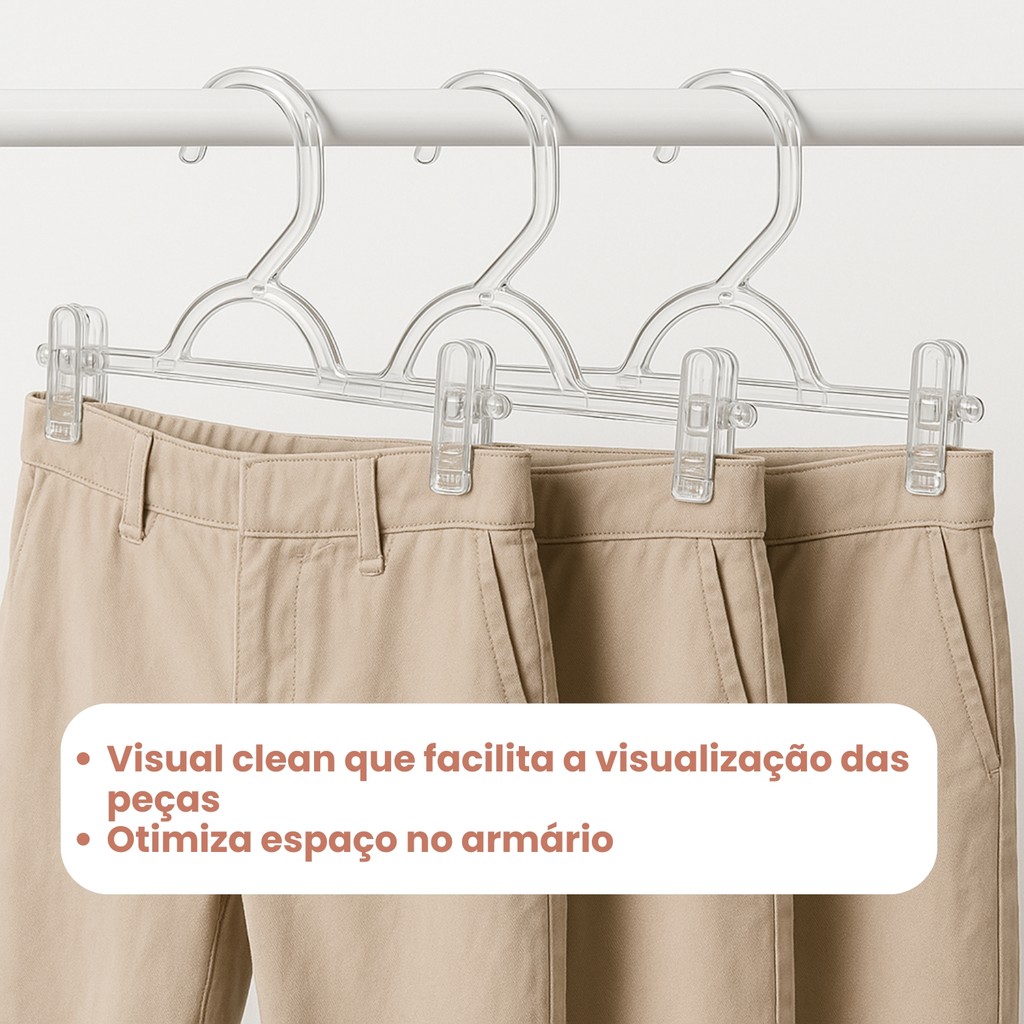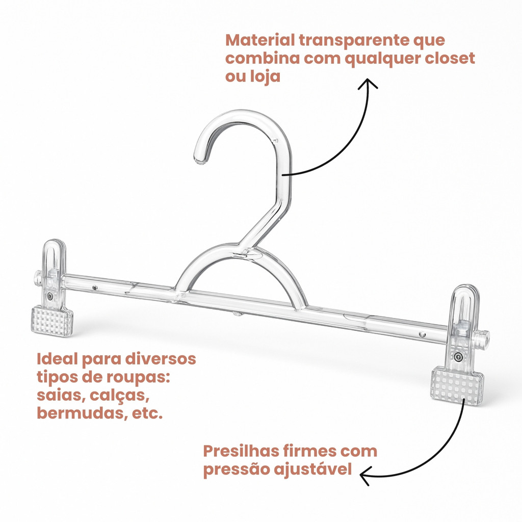 10 Cabides Acrílico Adulto Transparente + Presilha Reforçada para Roupas Calça Saia Bermuda