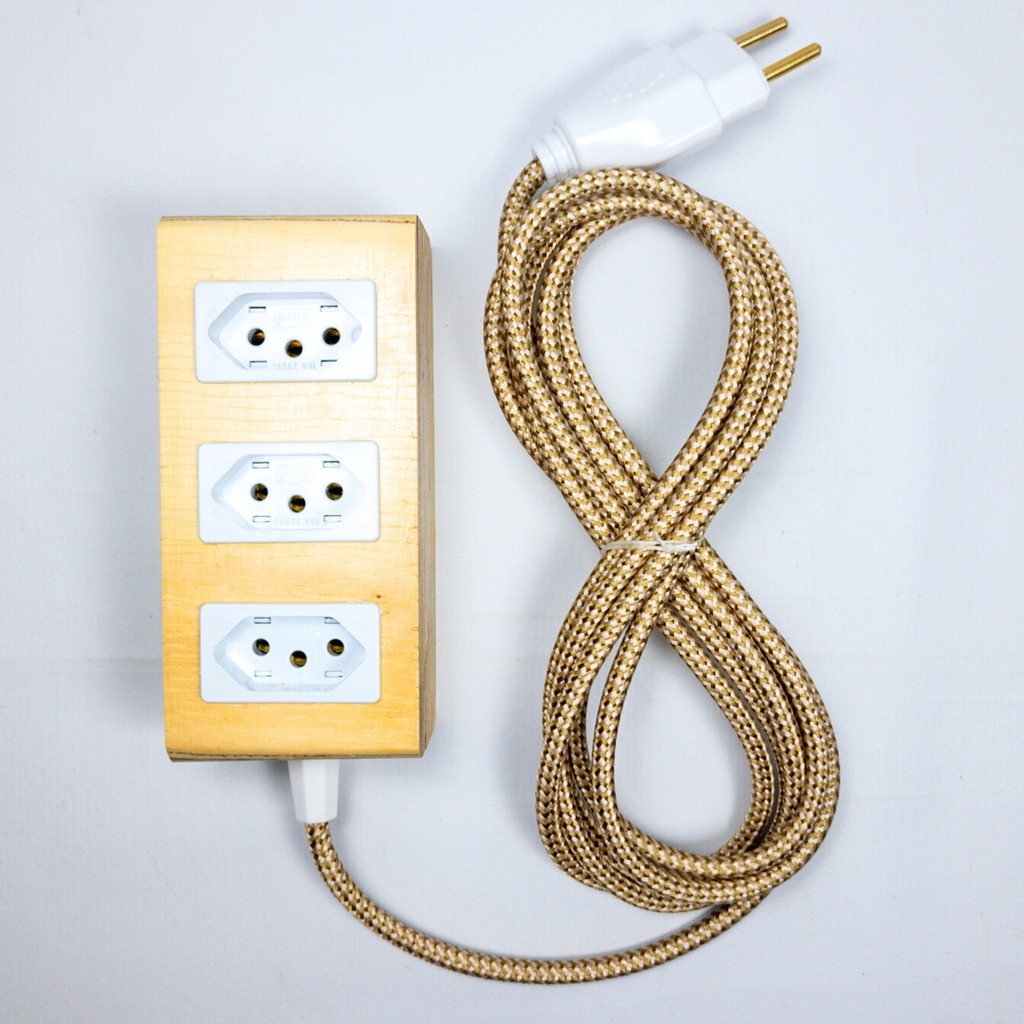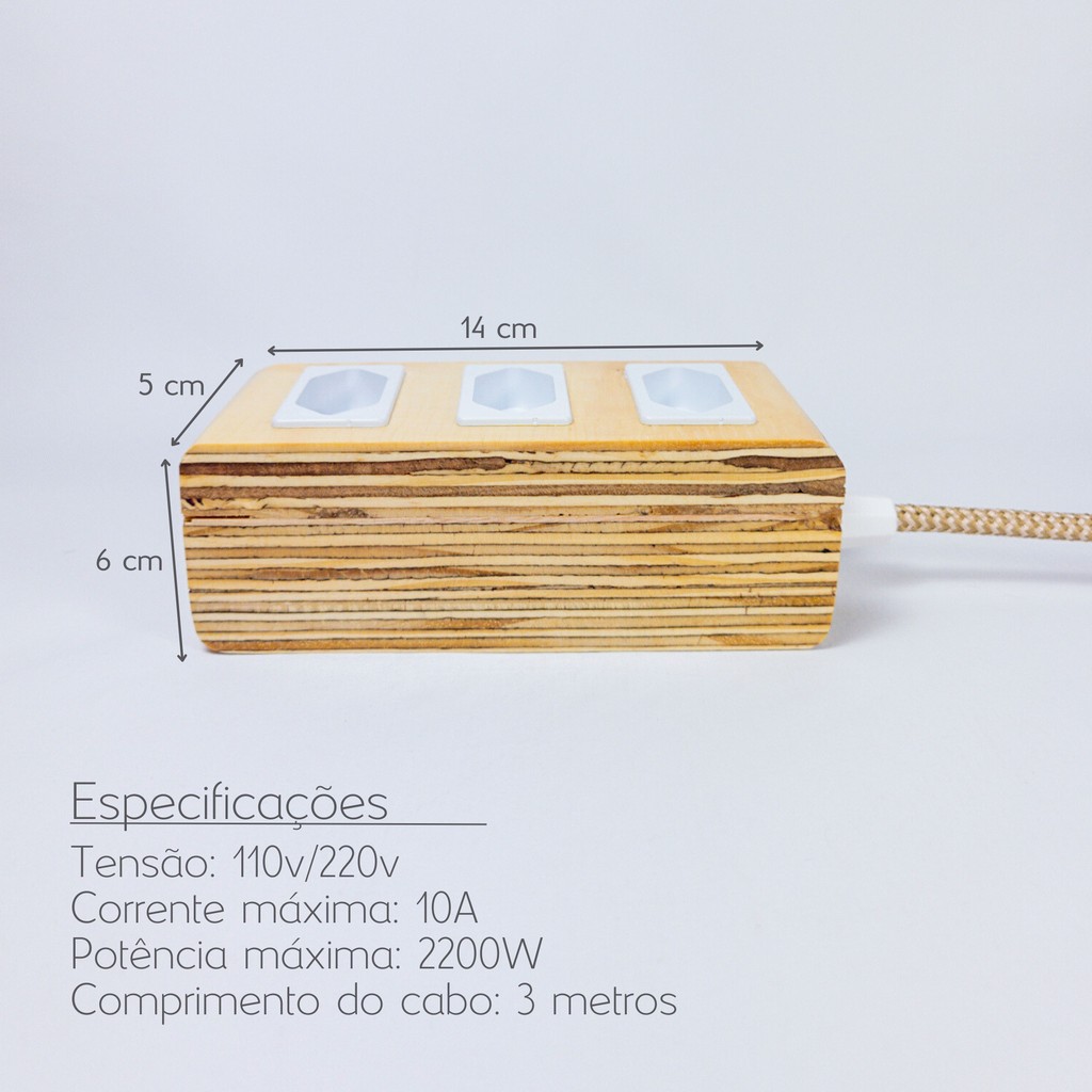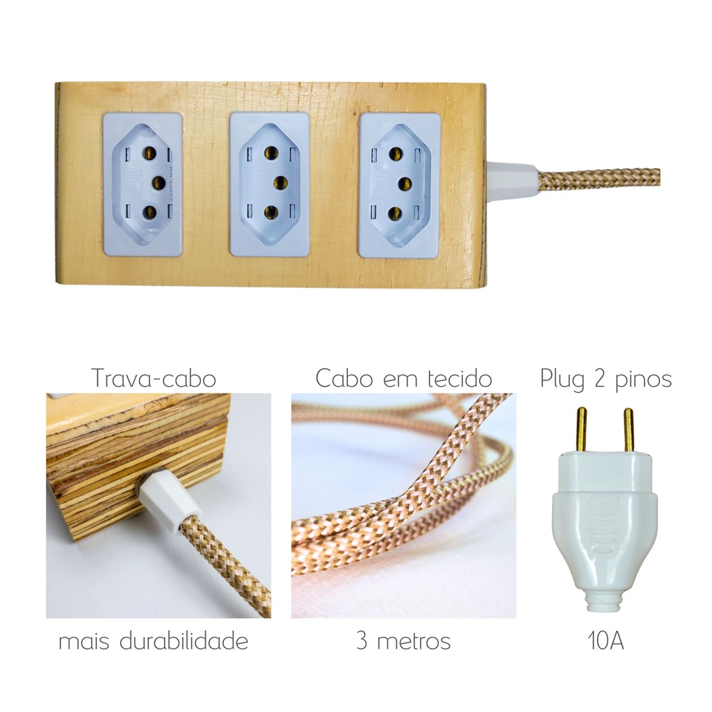 Extensão Elétrica Decorativa de Madeira 3 Tomadas 3 Metros
