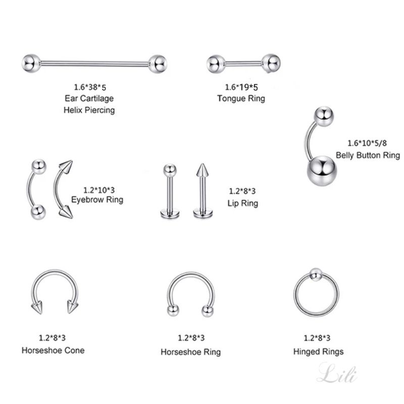 120Pçs Piercing aço cirúrgico perfurado língua sobrancelha umbigo ferradura nariz lábio anel brinco jóias do corpo
