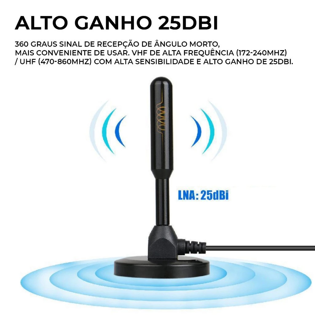 Antena Digital Amplificada Interna e Externa 3-5 Metros Base Imã Prova d'água 4DBI 4K HDTV/UHF/VHF
