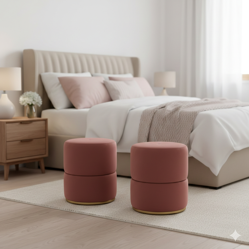 Kit 2 Puffs redondo moderno com detalhe no meio e base metálica - Rosê com dourado