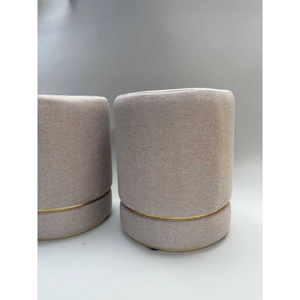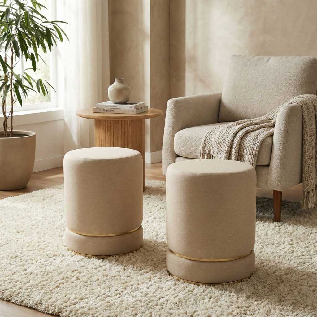 Conjunto de Puff minimalista redondo elegante para sala de estar com dois detalhe dourado - Bege com cintas douradas