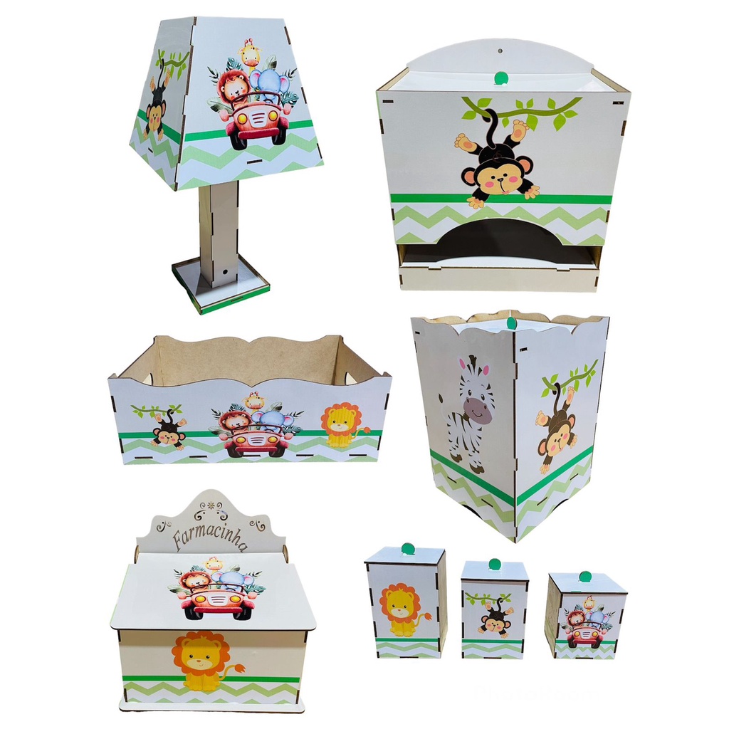 Kit Bebe Higiene Madeira Mdf Adesivado 8 Pçs Safári Desmontado