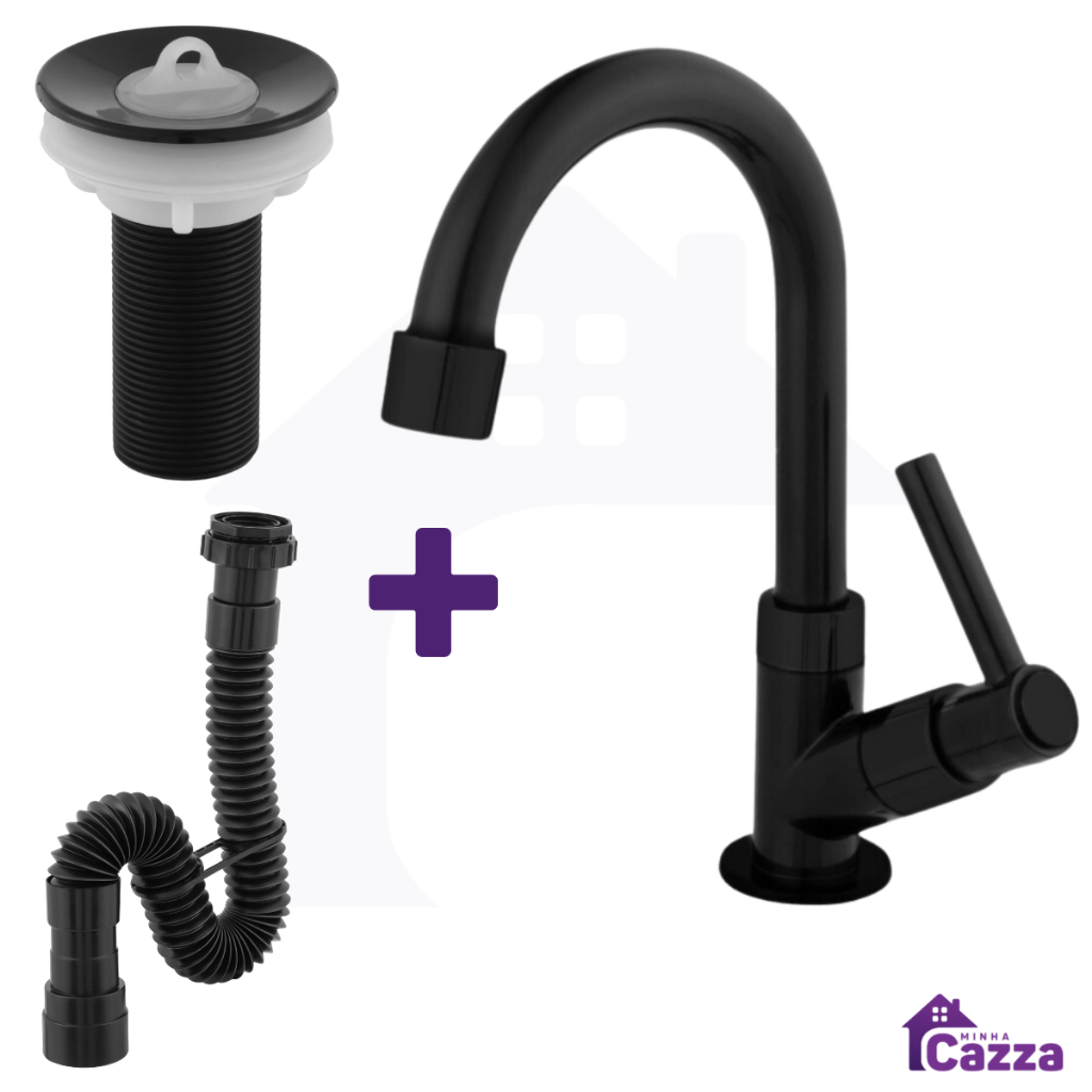 Kit Para Cuba Lavatório Torneira Pia de Banheiro Lavabo Preta ABS + Valvula 7/8 + Sifão