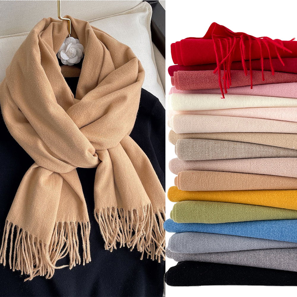 Lenço Grosso Cachecol de Lã Longo com Franjas Feminino Manta Lisa Echarpe Fofinho Pashimina Outono Inverno 75X180 - Est