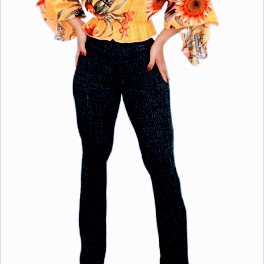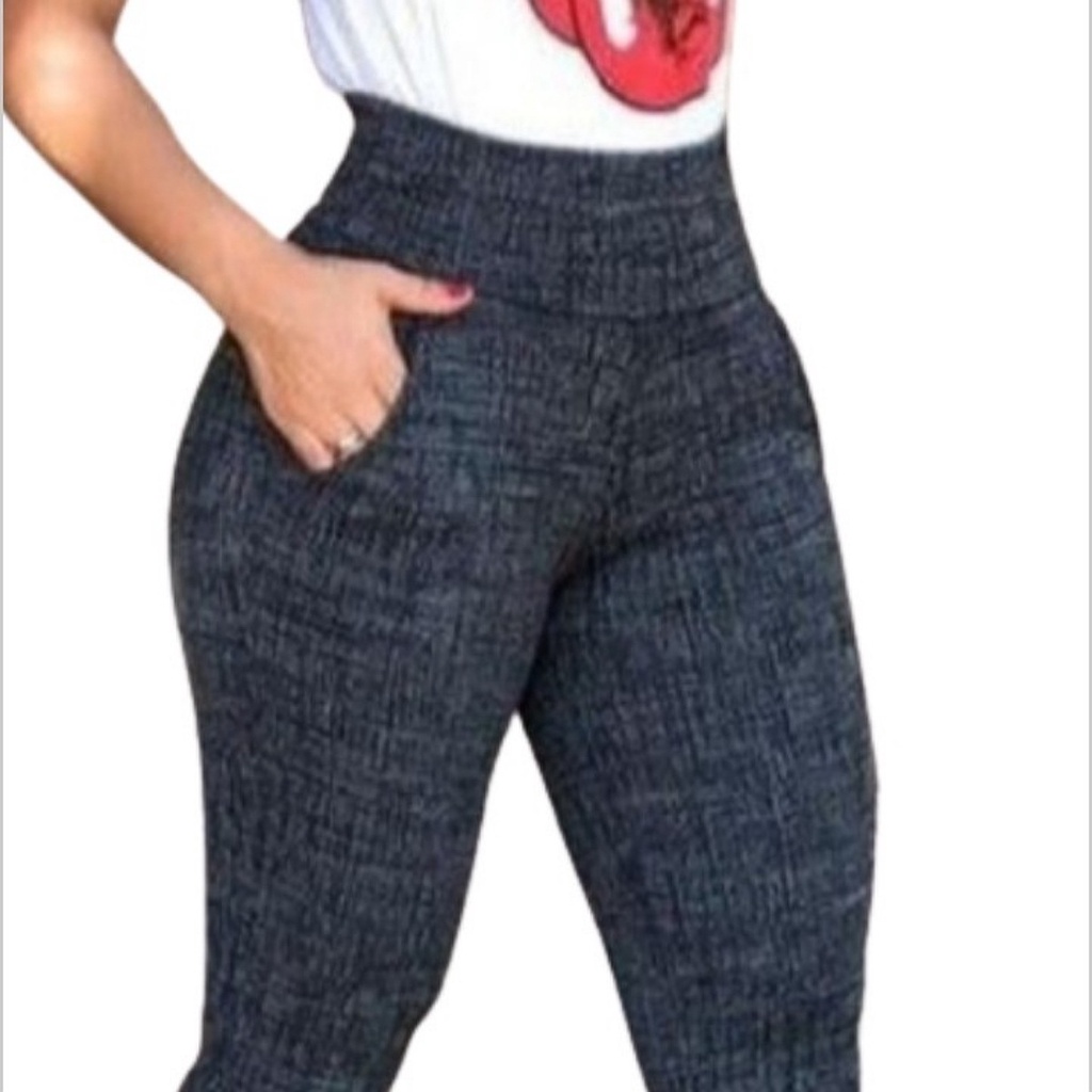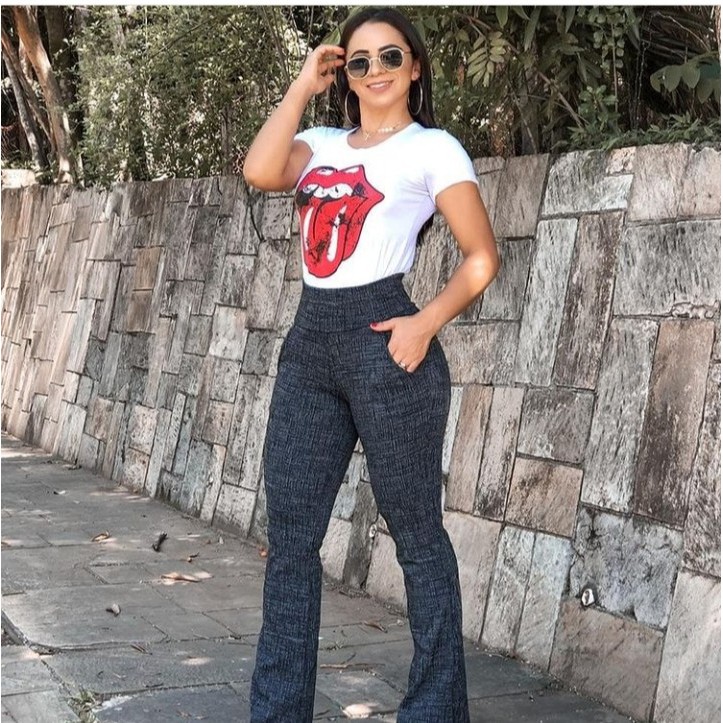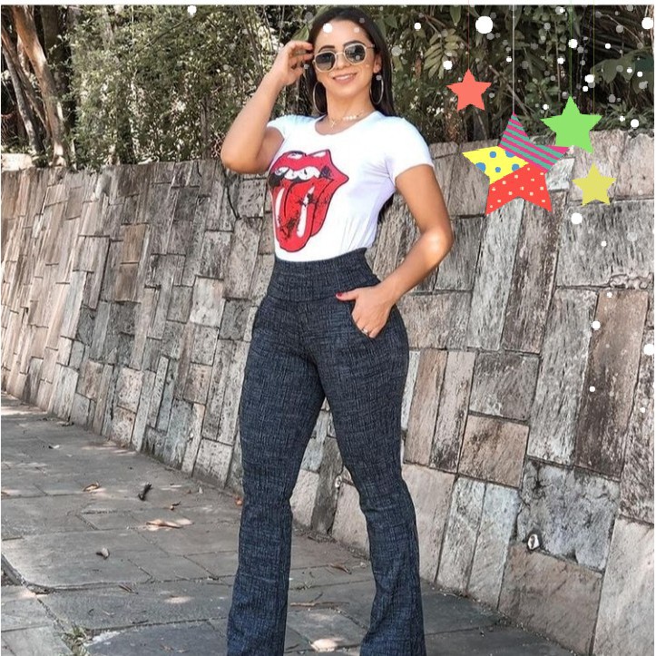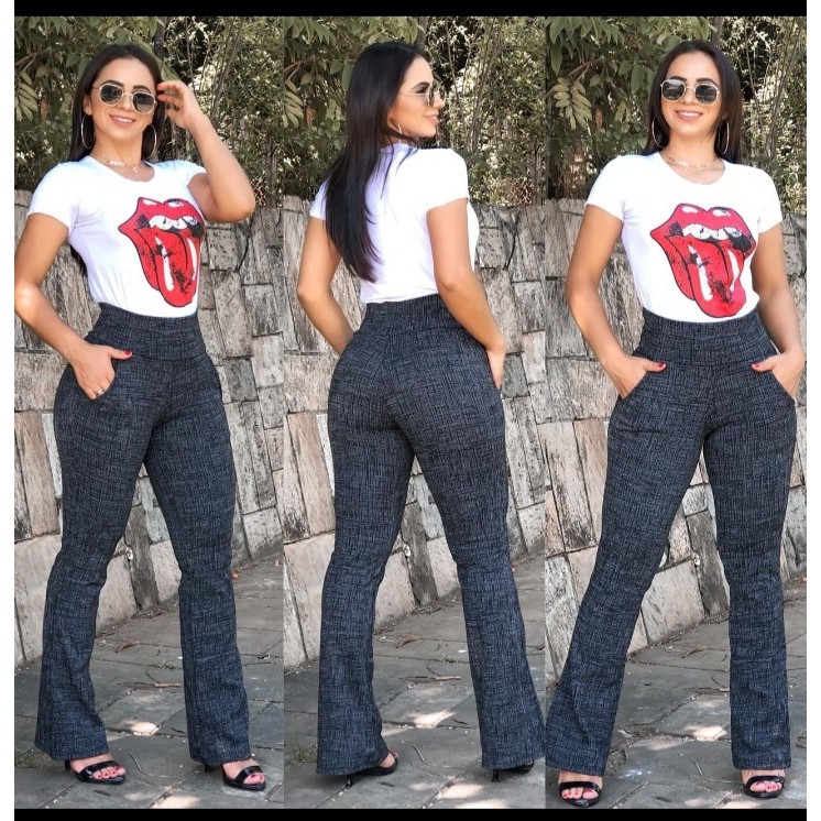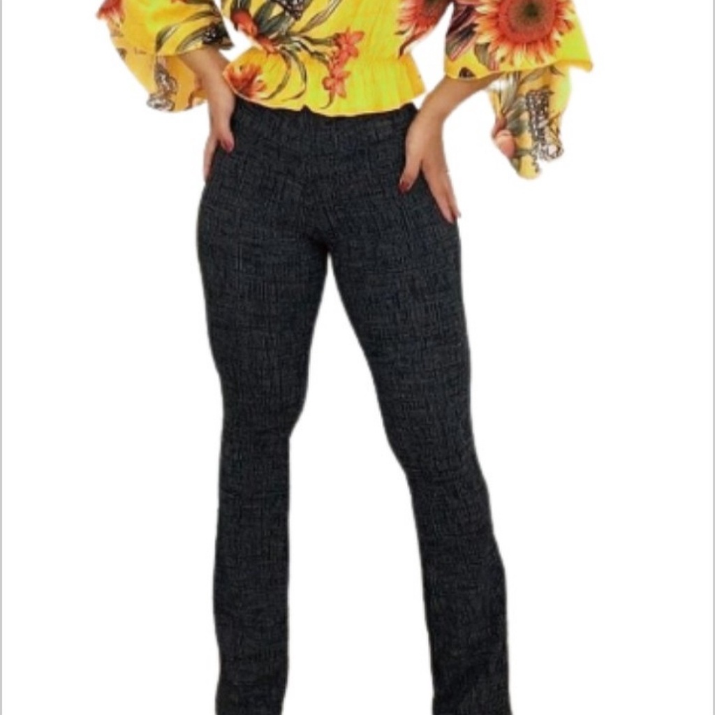 Calça flare social feminina com bolso cintura alta em tecido jacard