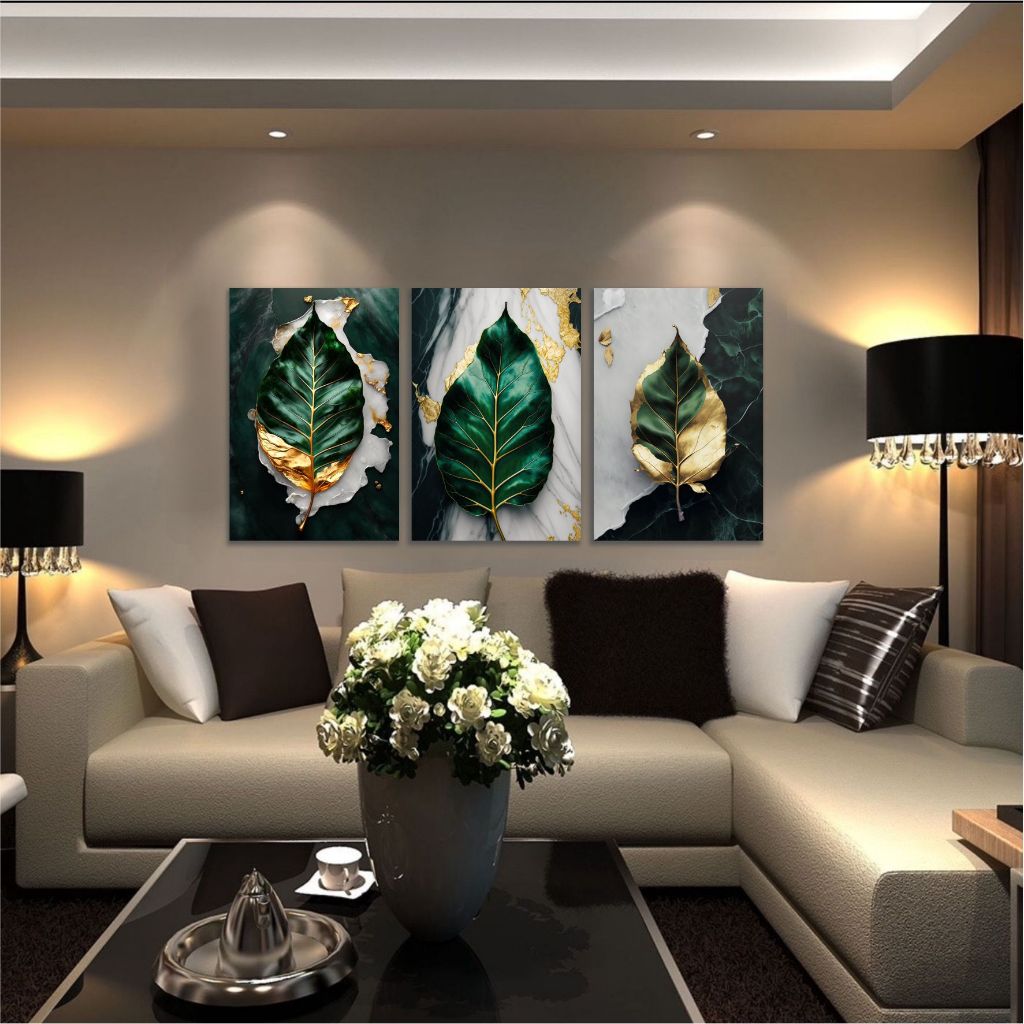 Quadro Decorativo Folha Verde Ouro Elegante Moderno Quarto 3 PEÇAS