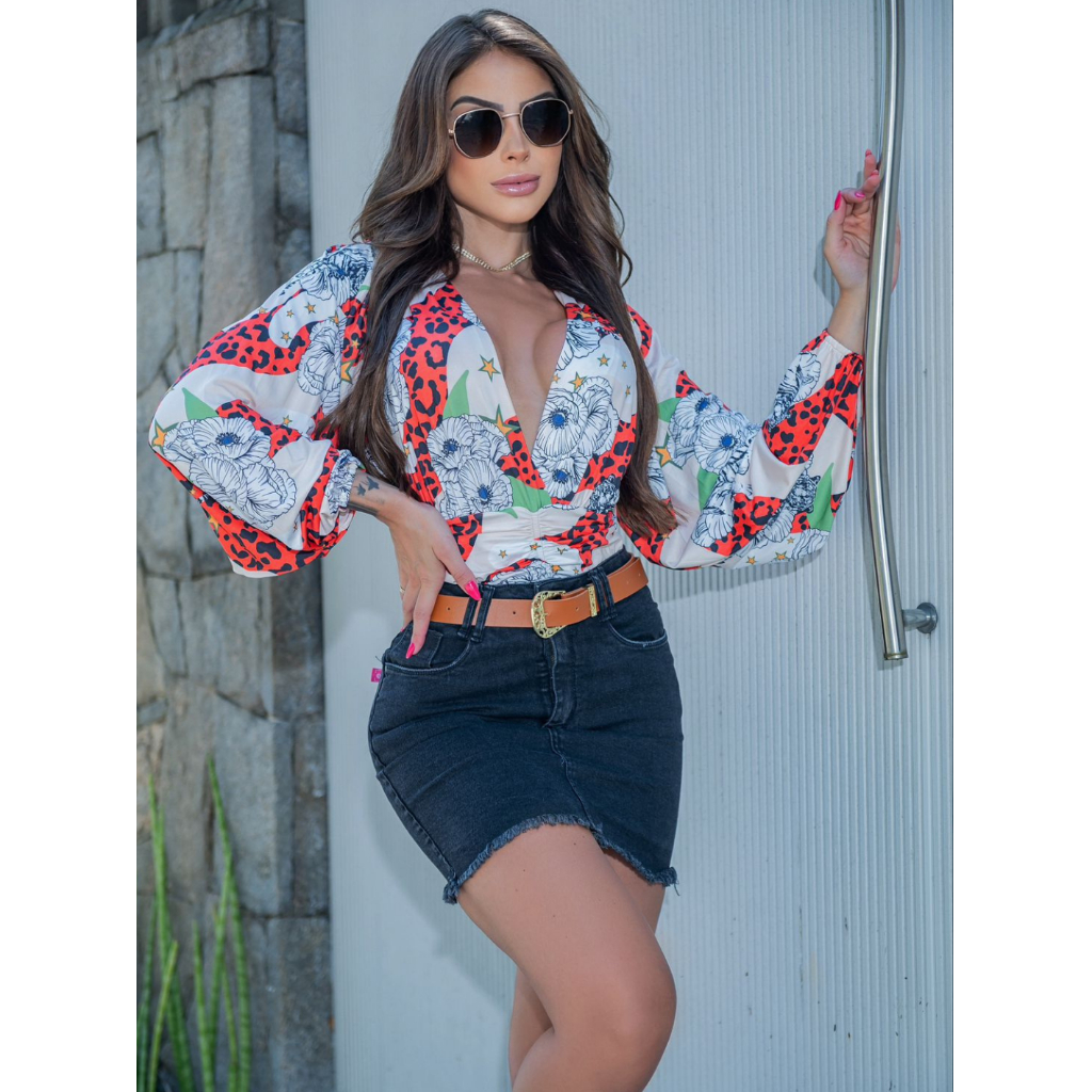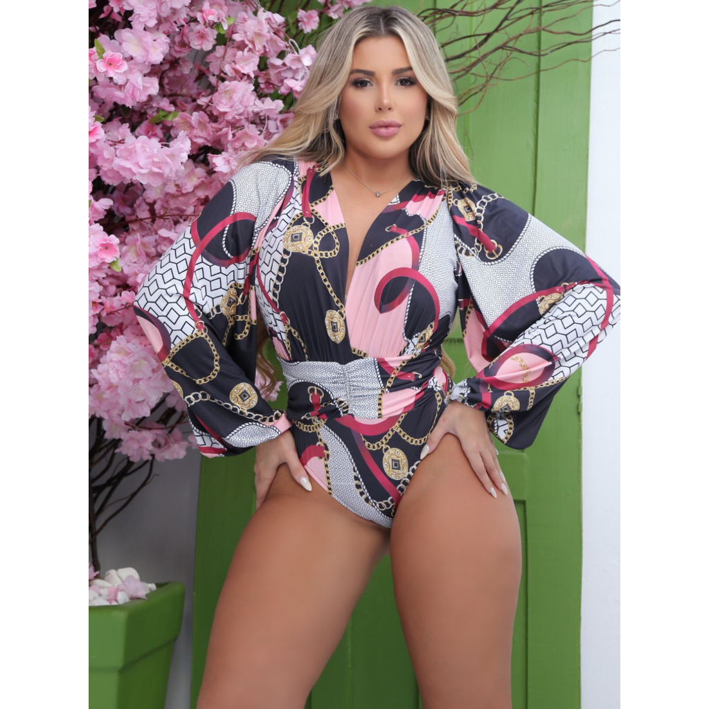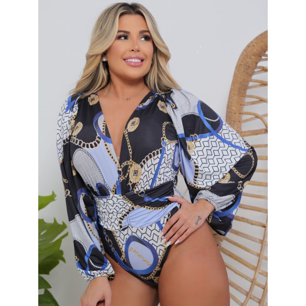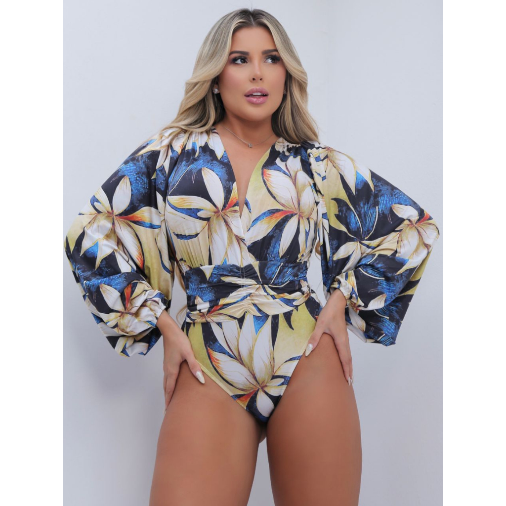 Body Feminino Manga Longa Bufante Estampado Transpassado Decotado Gola V Moda Blogueira