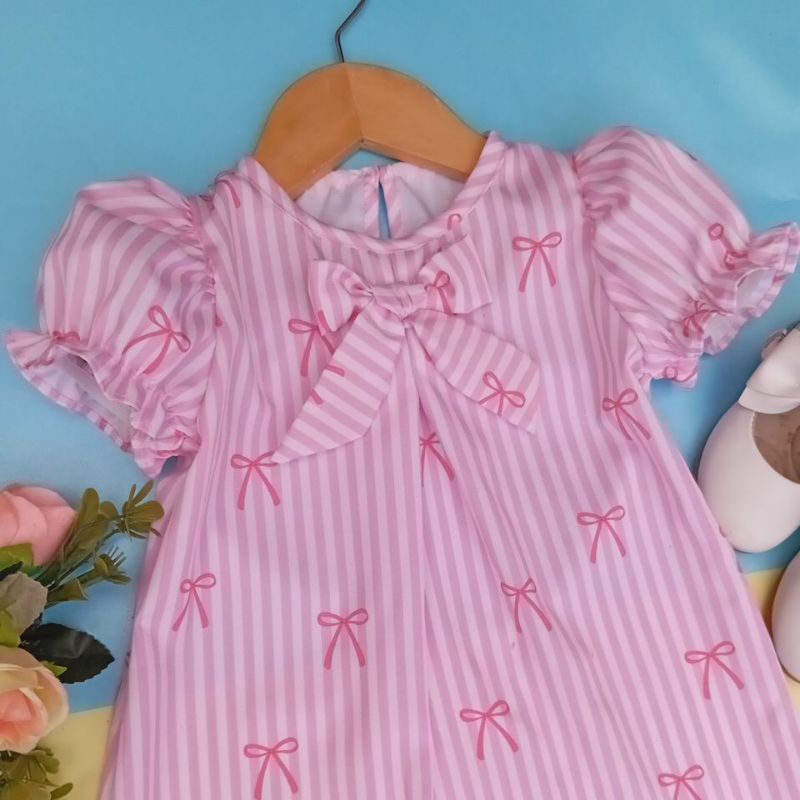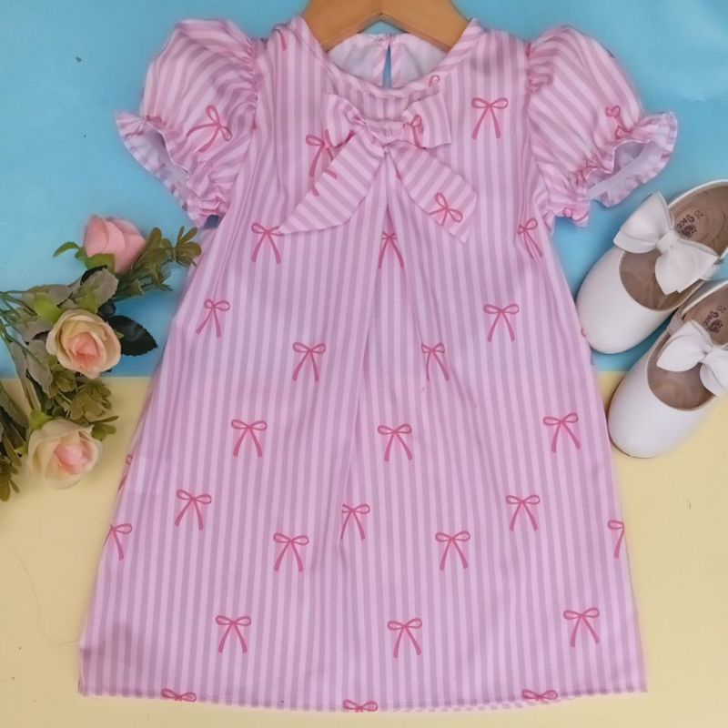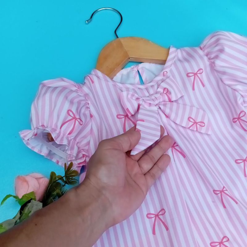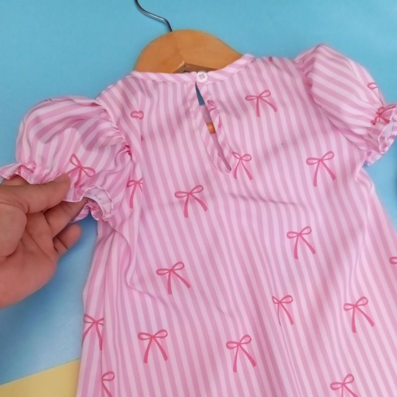 vestido infantil trapézio listrado rosa