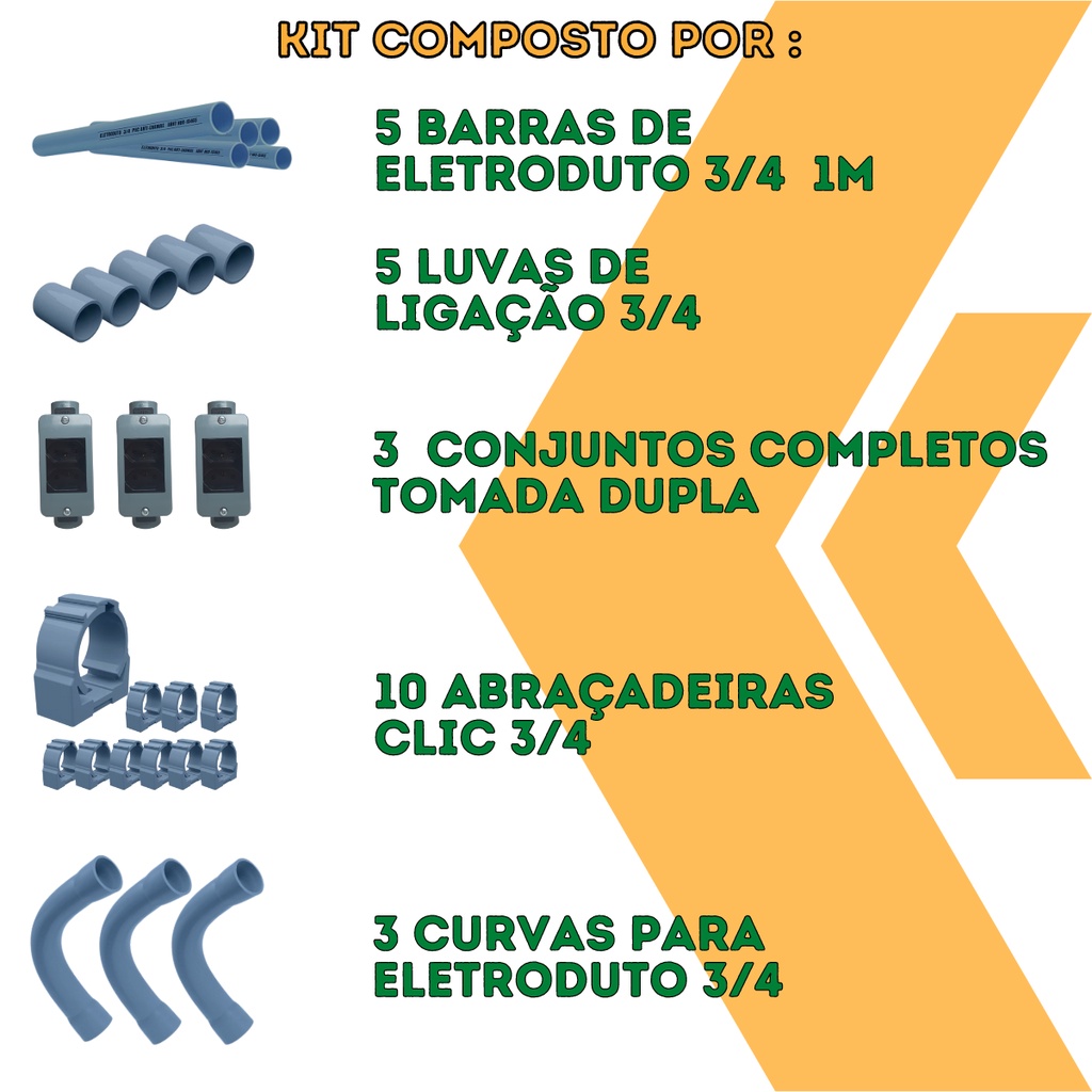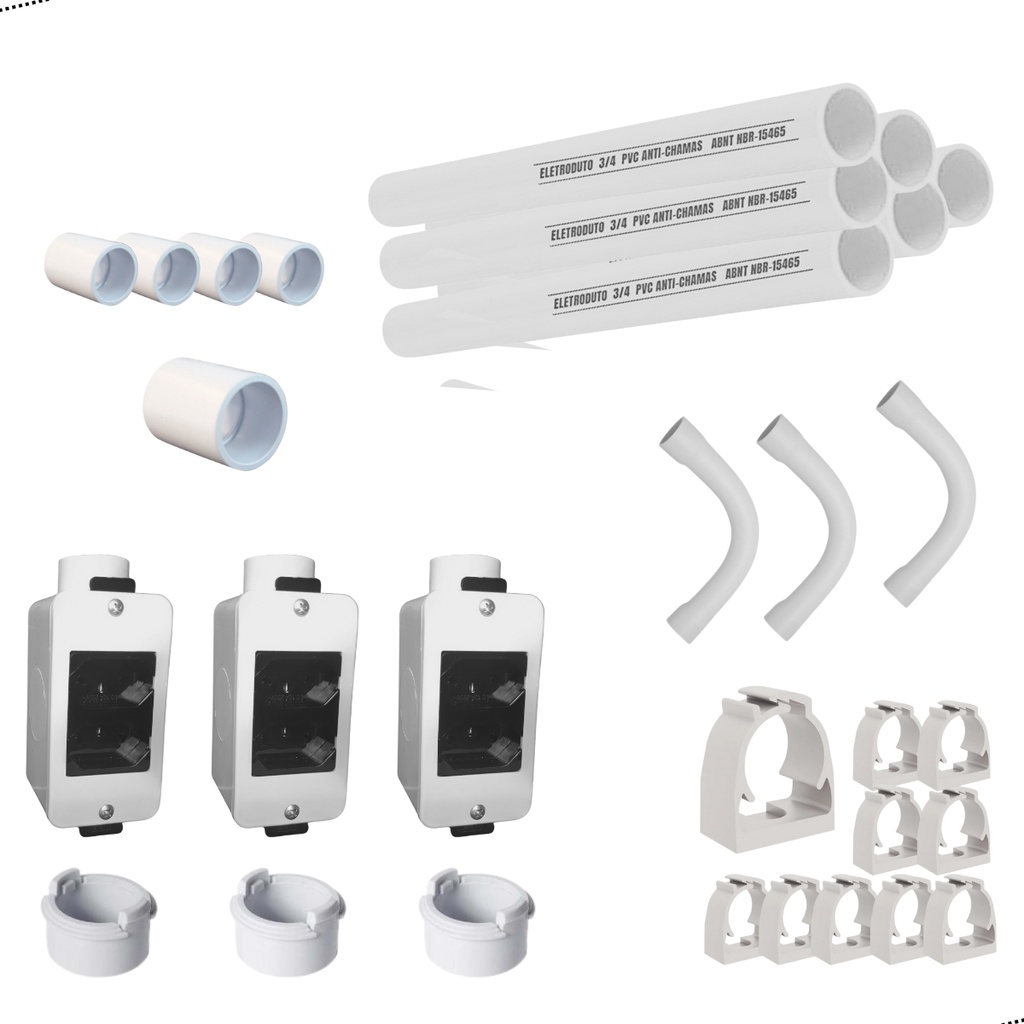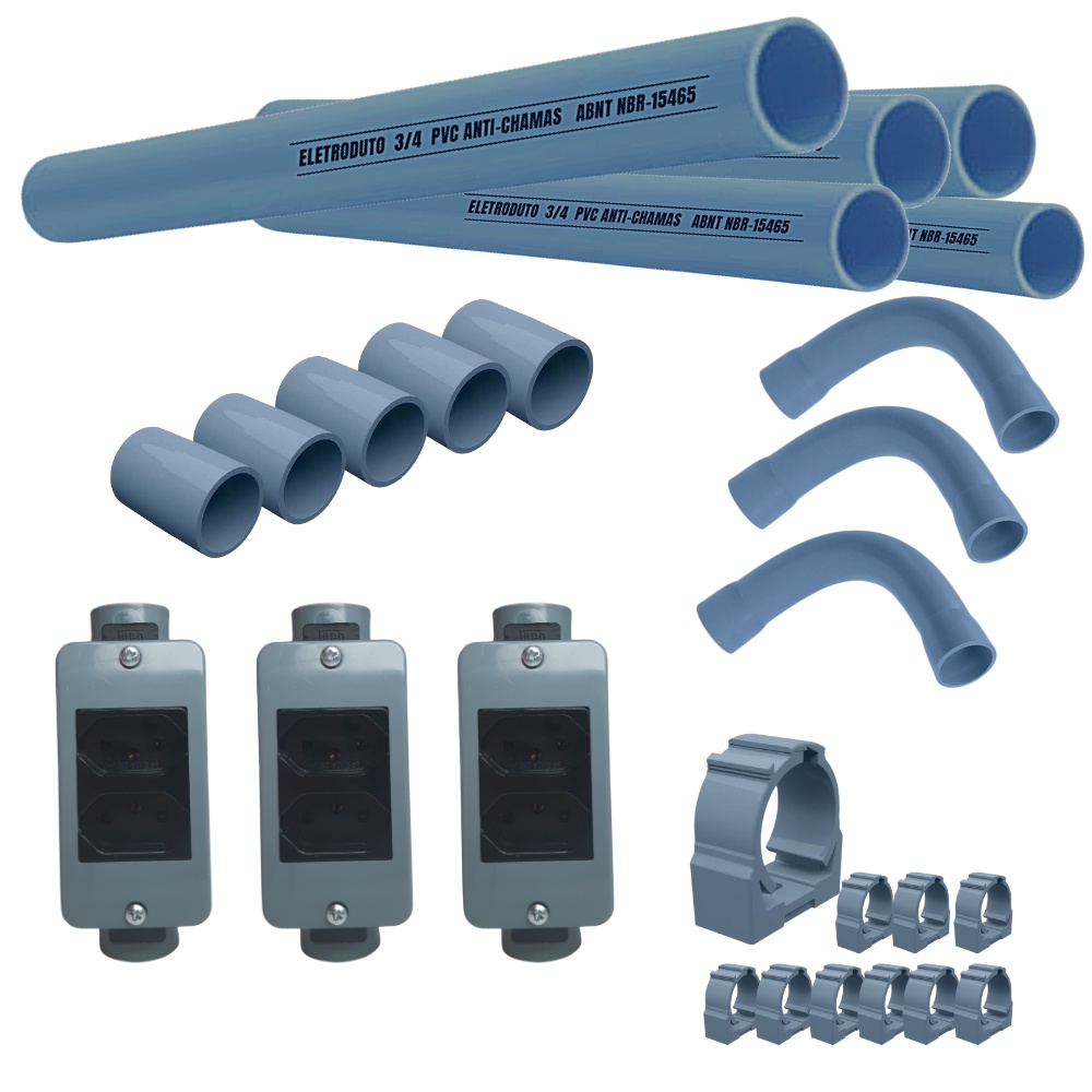 Kit 3 conduletes com tomadas duplas simples completo para Conduite 3/4 sobrepor e demais componentes para instalação