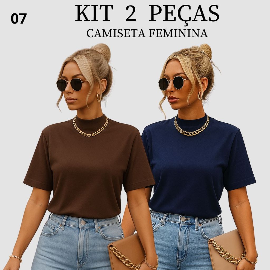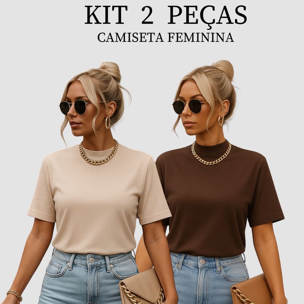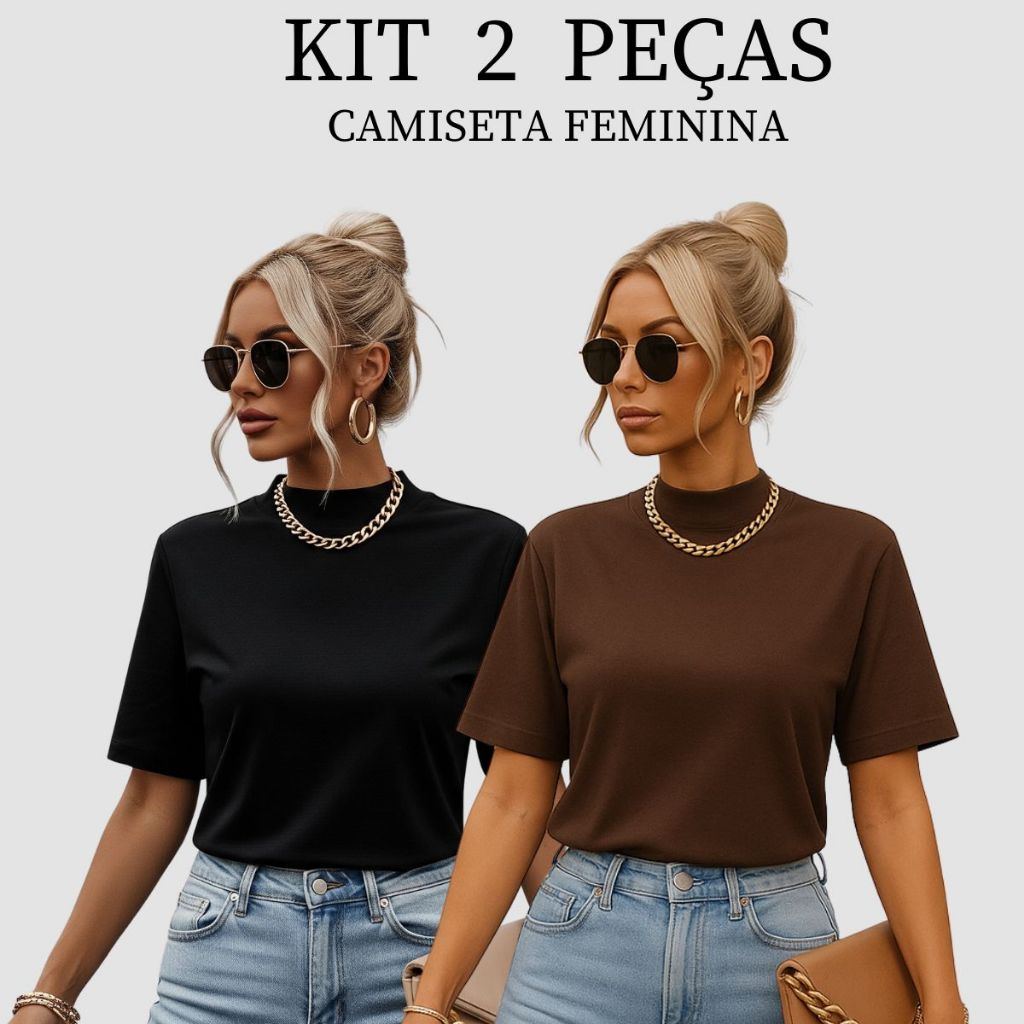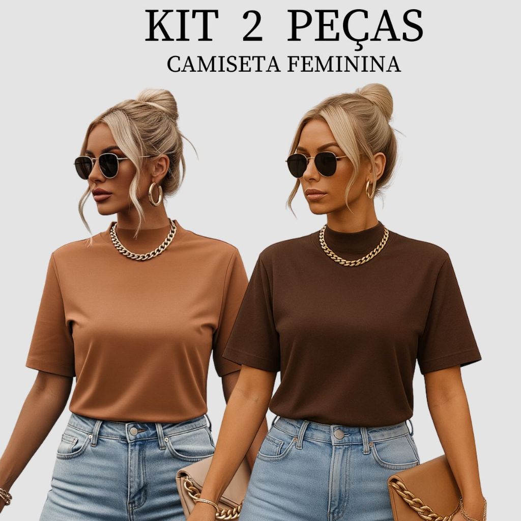 Kit 2 T-shirt Feminina Camiseta Gola Alta Simples 100% Algodão Premium T-shirt Marrom Choco Mousse Gola Ribana