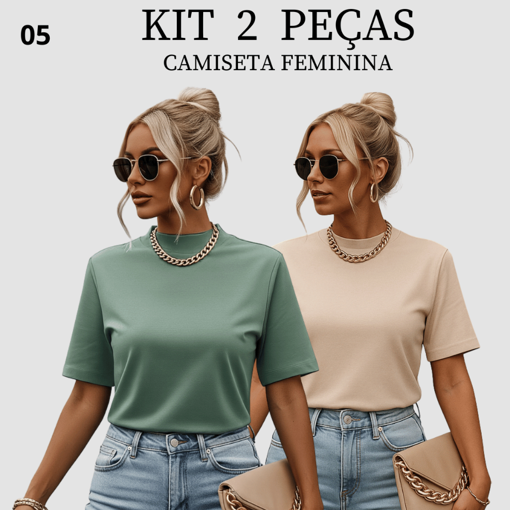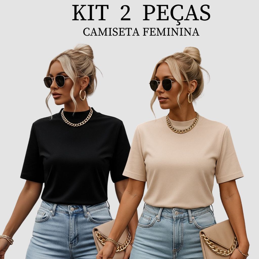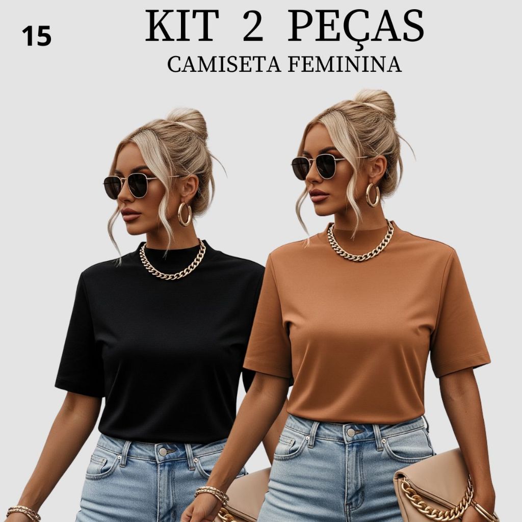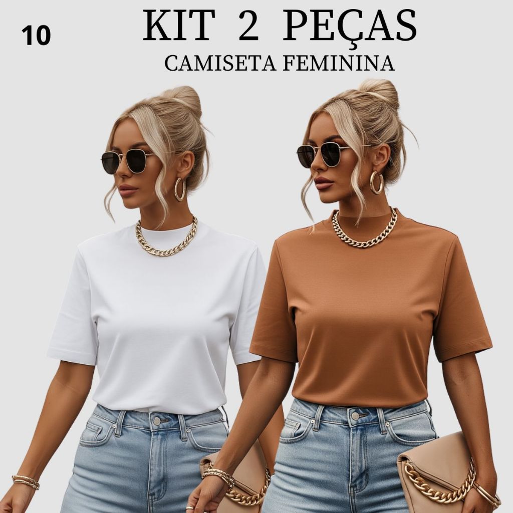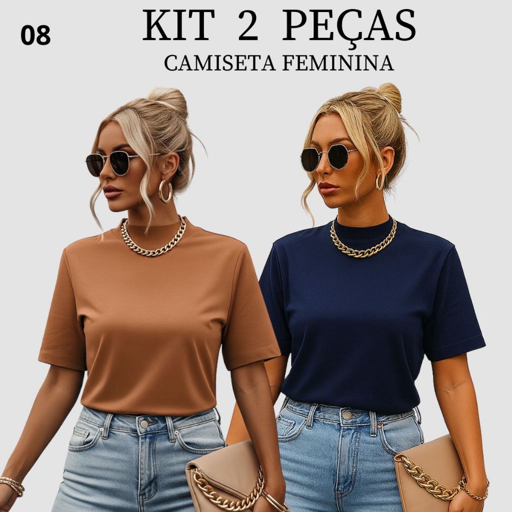 Kit 2 T-shirt Feminina Camiseta Gola Alta Simples 100% Algodão Premium T-shirt Marrom Choco Mousse Gola Ribana